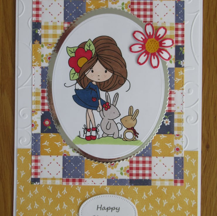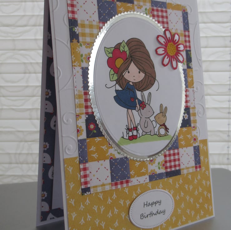 This lovely image of Winnie with her furry friends has been printed then hand coloured by me, to coordinate with the backing papers. The image has been cut using decorative oval dies to create a framed effect and these sit upon several layers of decorative papers and embossed cardstock. Silver foil card has been used for that touch of sparkle and the inside of the card is finished to coordinate with the front.