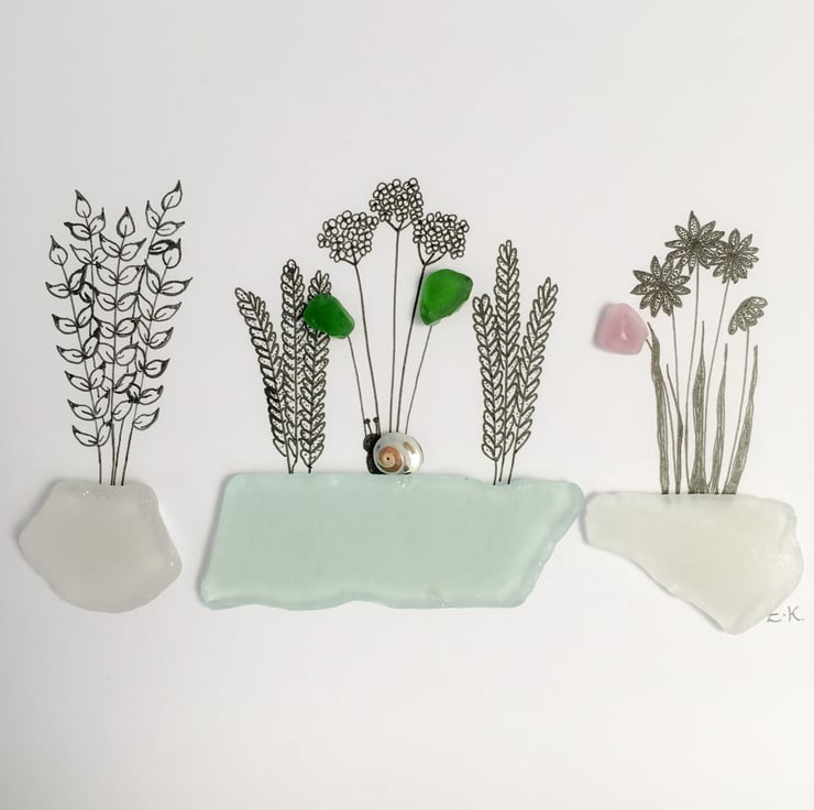 Hand drawn by myself in ink fine liner with lovely pieces of white, aqua, pink and green sea glass. Also features a little shell snail. Beach finds found by myself on the beaches of Falmouth, Cornwall. Would look lovely in a frame.