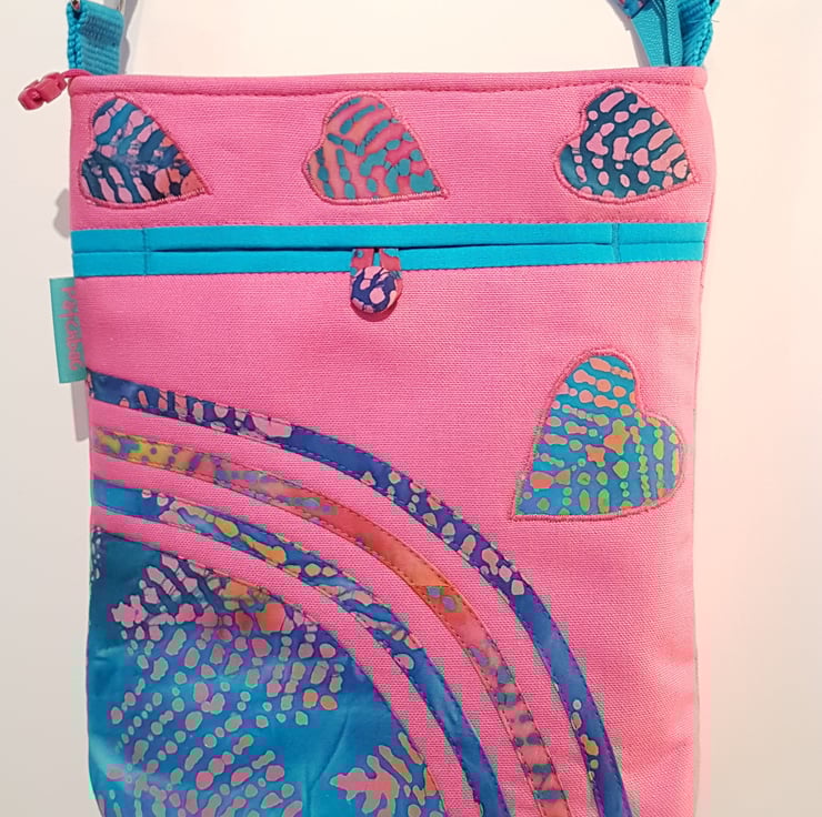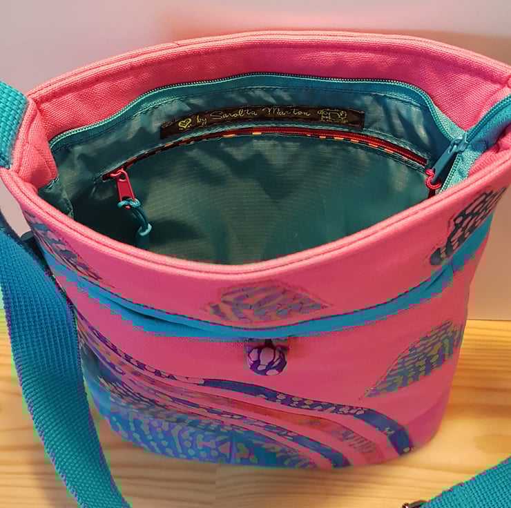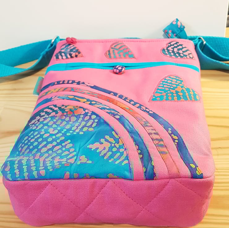 Handmade patchwork shoulder bag /crossbody bag with batik leafs patterned fabric and batik leafs applique on pink canvas background. Tha bag has pocket on the front with covered button closure, and inner pocket with zipper closure. The shoulder strap is adjustable. The bag closing with zipper on the top .The lining made from waterproof fabric. Dimensions: width:24cm,hight : 27cm,depth 6,5 cm on the top of the bag.