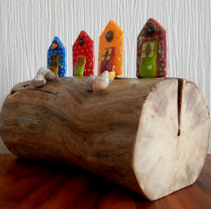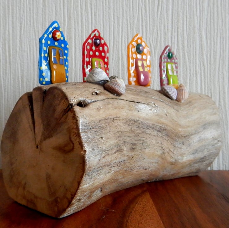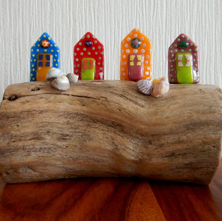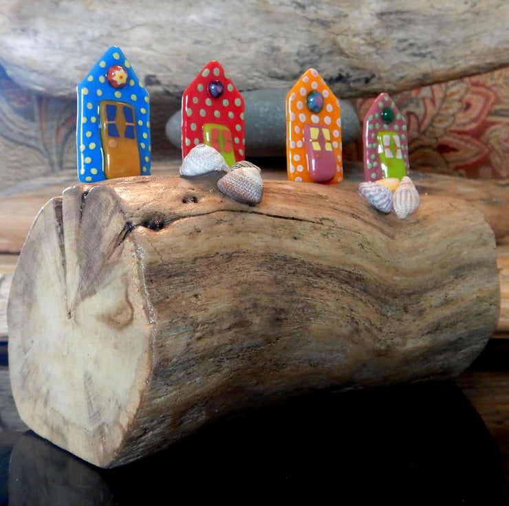 This little ornament is my newest item in my range. It is four cute and colourful fused glass beach huts mounted on driftwood.