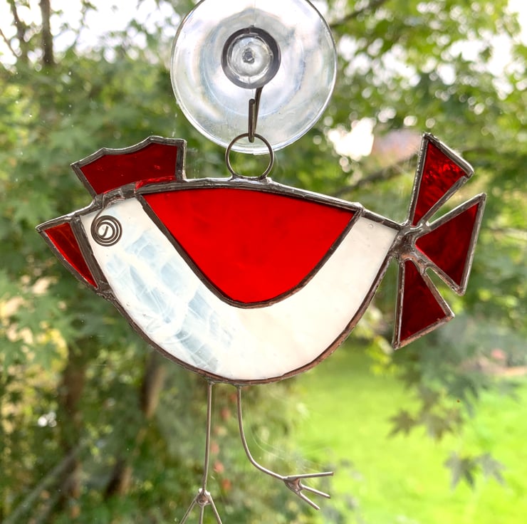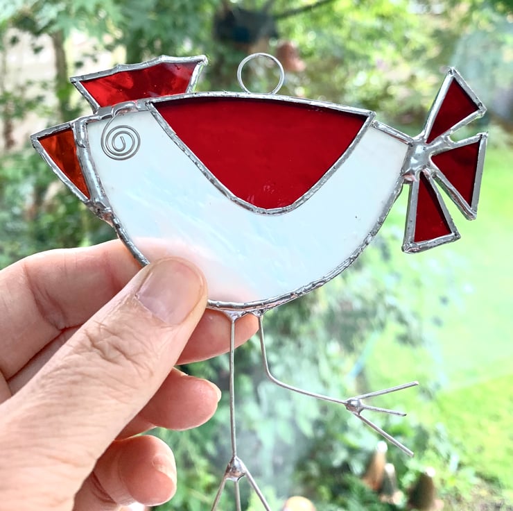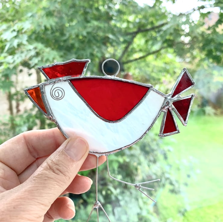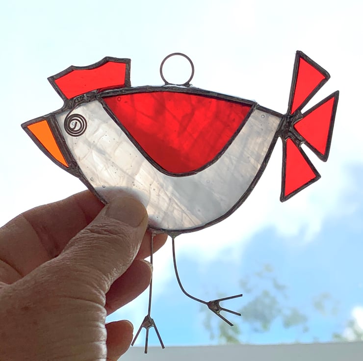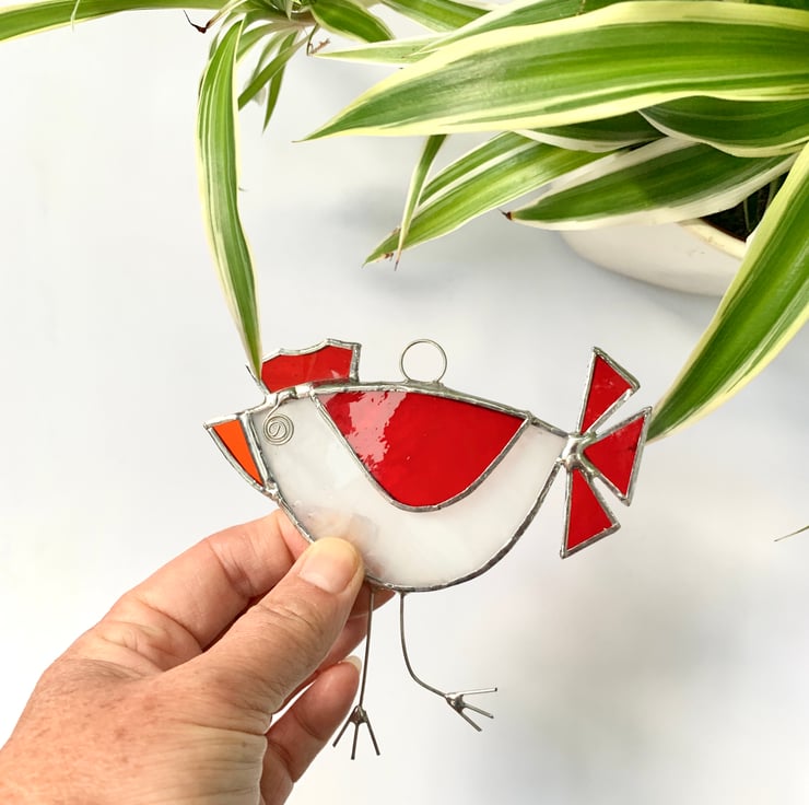 I have two white/red hens, the glass used for this bird is a white streaky sea glass, red sea glass for the comb, orange glass for the beak and red textured glass for the wing and tail.