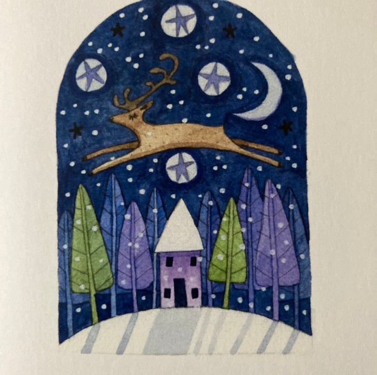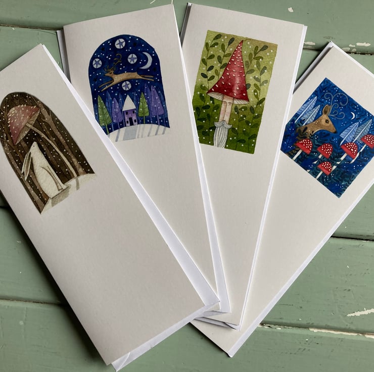A bundle of four cards, 80 x 210mm, supplied with envelope and blank inside. These designs are also available with handwritten greeting and star sequins; please see other listing. Thankyou!