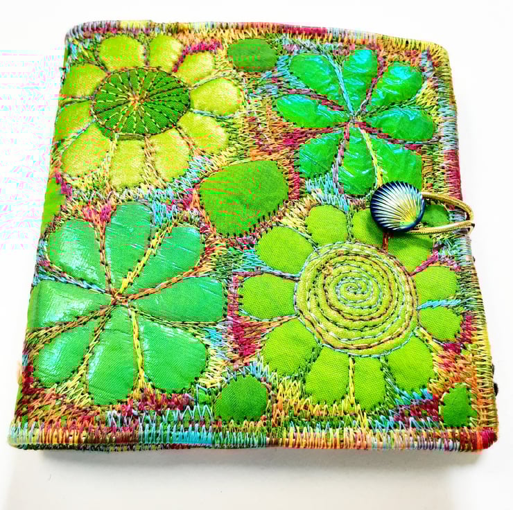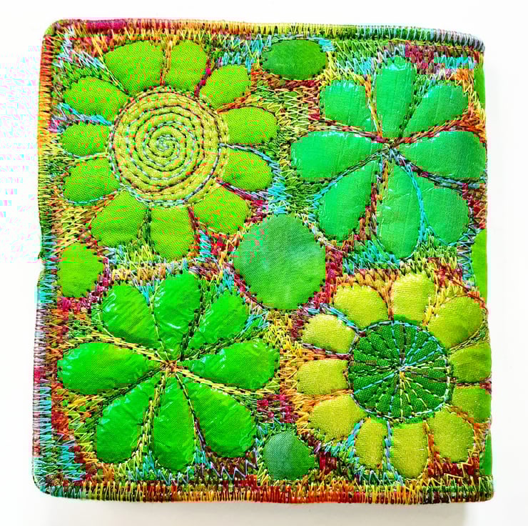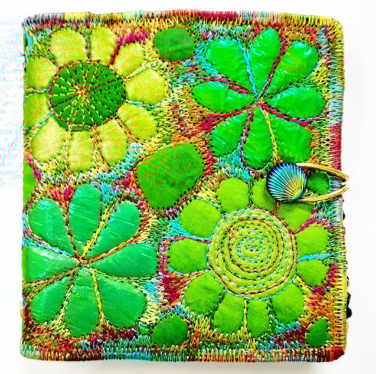 Made from layers of fabric including hand dyed Egyptian cotton and silk fabrics using the free machine embroidery style of sewing