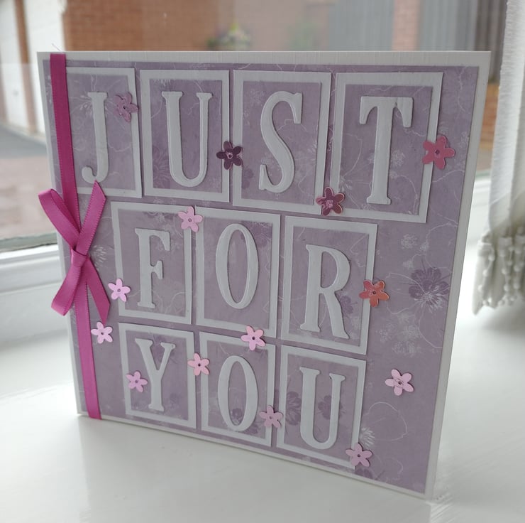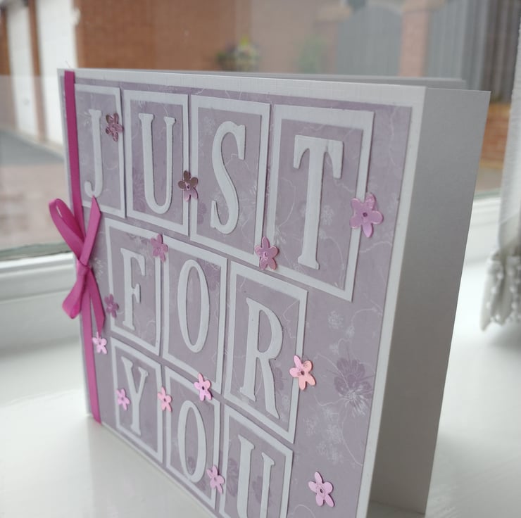 A completely handmade and uniquely designed card. Consisting of just for you due cut from white card, mounted onto lilac floral then white card then onto linen effect pristine white card. Embellished with pink flower sequins. Finished off with pink ribbon and bow