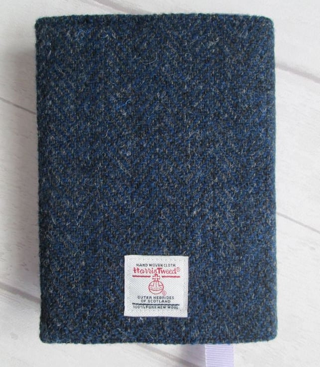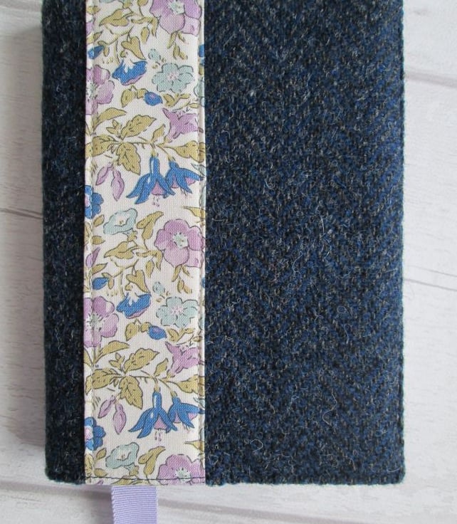 I've taken a lovely piece of handwoven 'Harris Tweed' in a Navy/Charcoal herringbone pattern and teamed if with a piece of classic Liberty London Fabric to create this one of a kind notebook cover. Lined with another Liberty London Fabric print it incorporates a handy ribbon place marker and bears the official 'Harris Tweed' label on the rear.