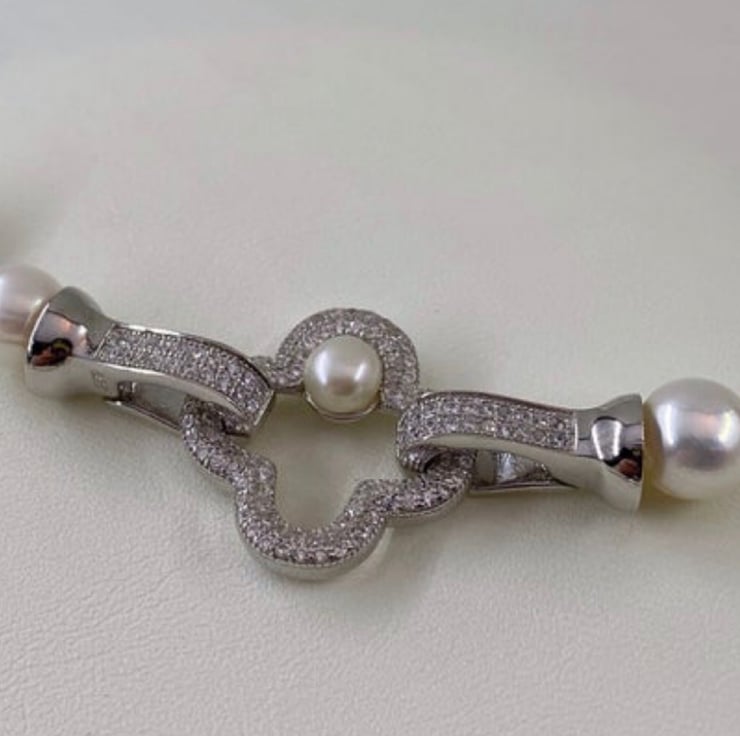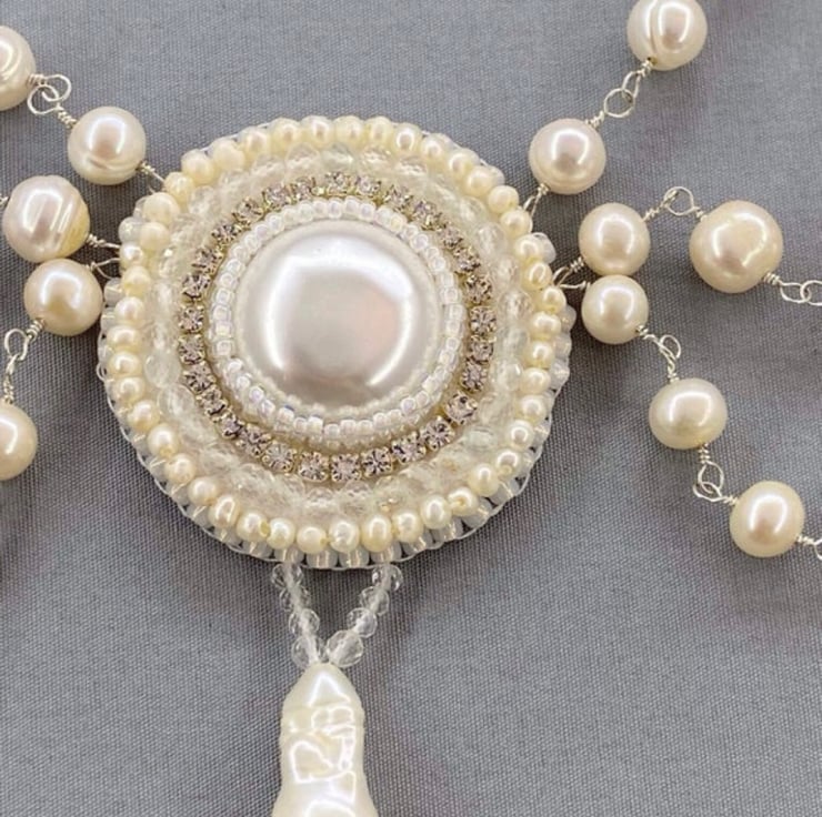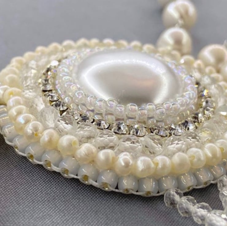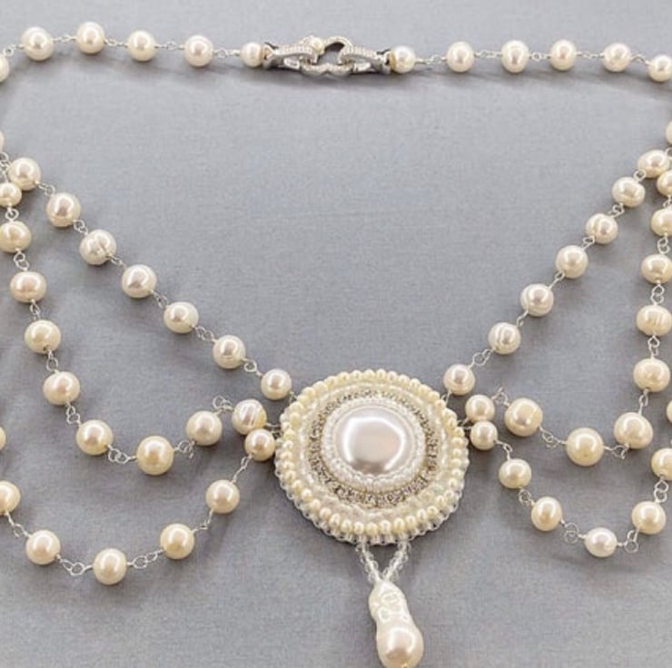 A truly stunning choker necklace featuring lots of ivory cultured pearls which have been rosary linked with sterling silver wire, beaded around the pendant, the shell pearl cabochon, there’s even a real pearl in the sterling silver clasp too! There’s also topaz on the necklace.