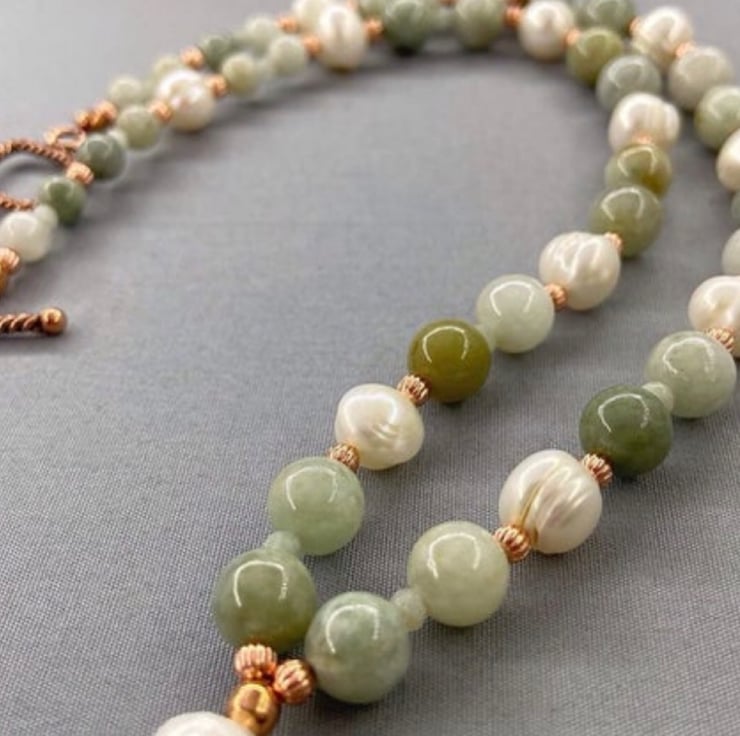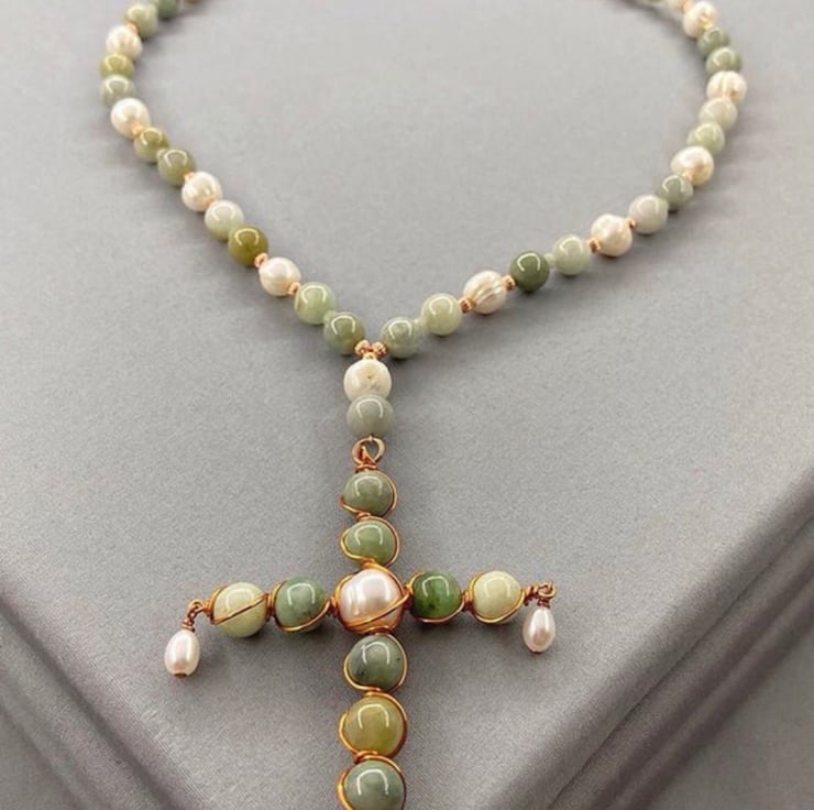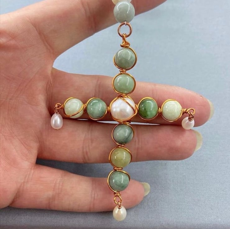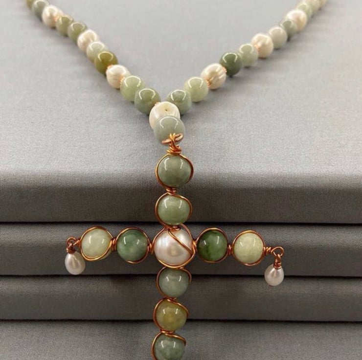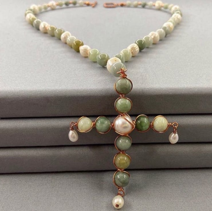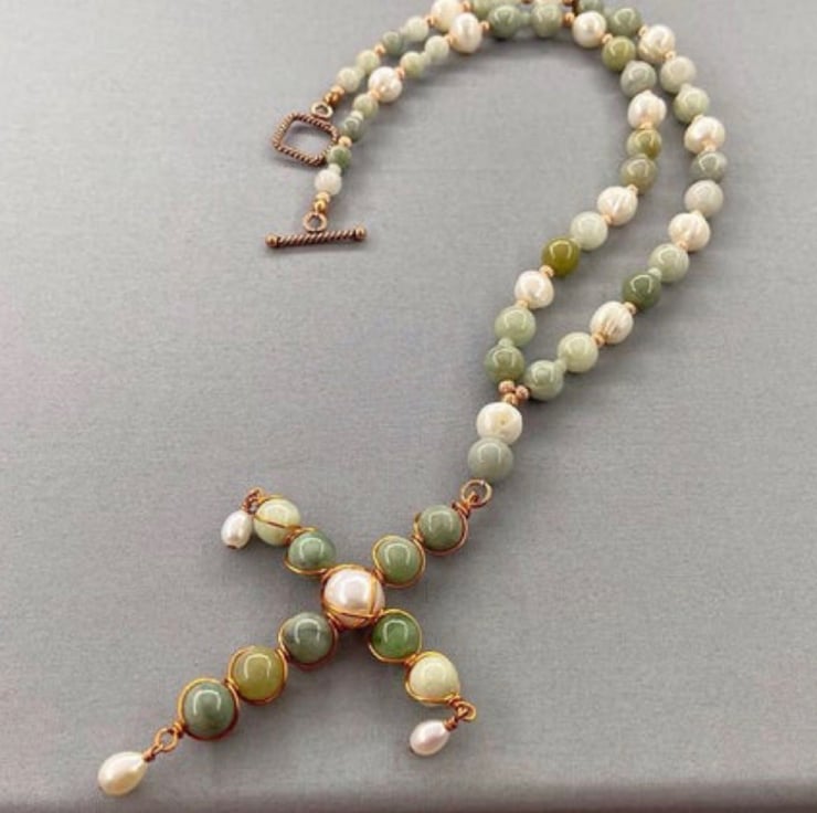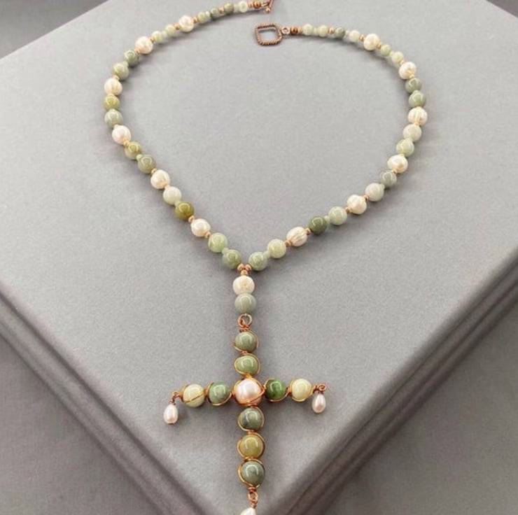 A beautiful delicately coloured cross necklace wire wrapped with copper wire and featuring the soft green hues of Burmese Jadeite with accenting ivory cultured pearls with ribbed copper spacer beads and copper clasp.