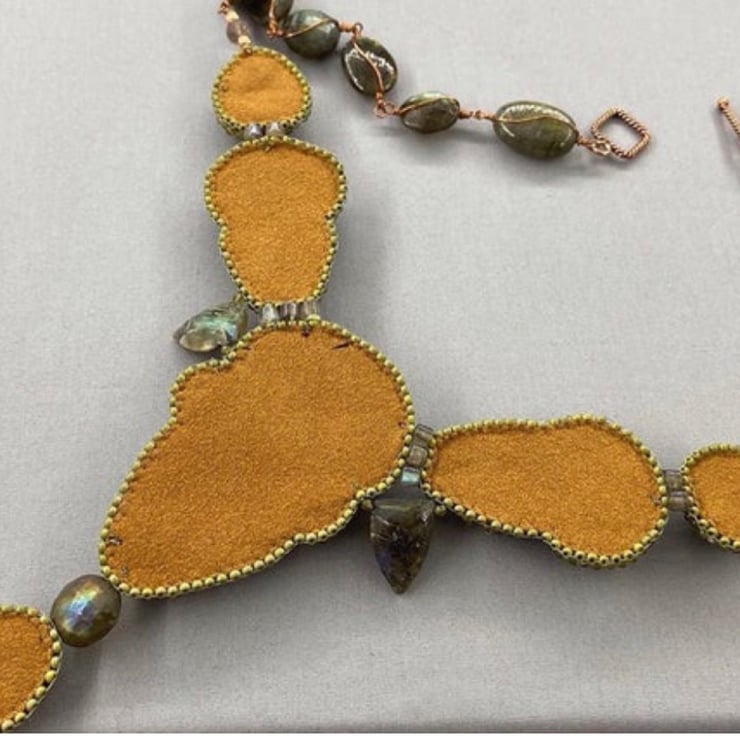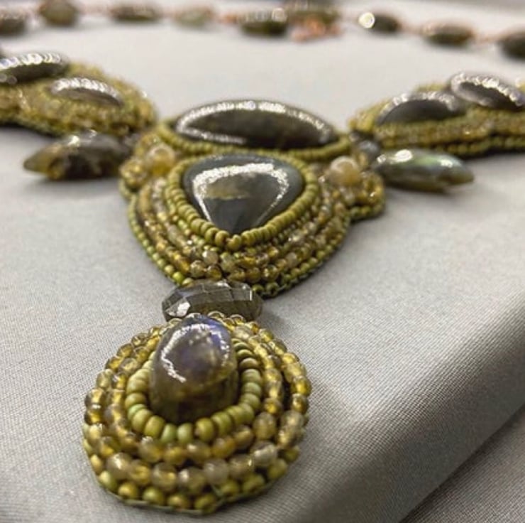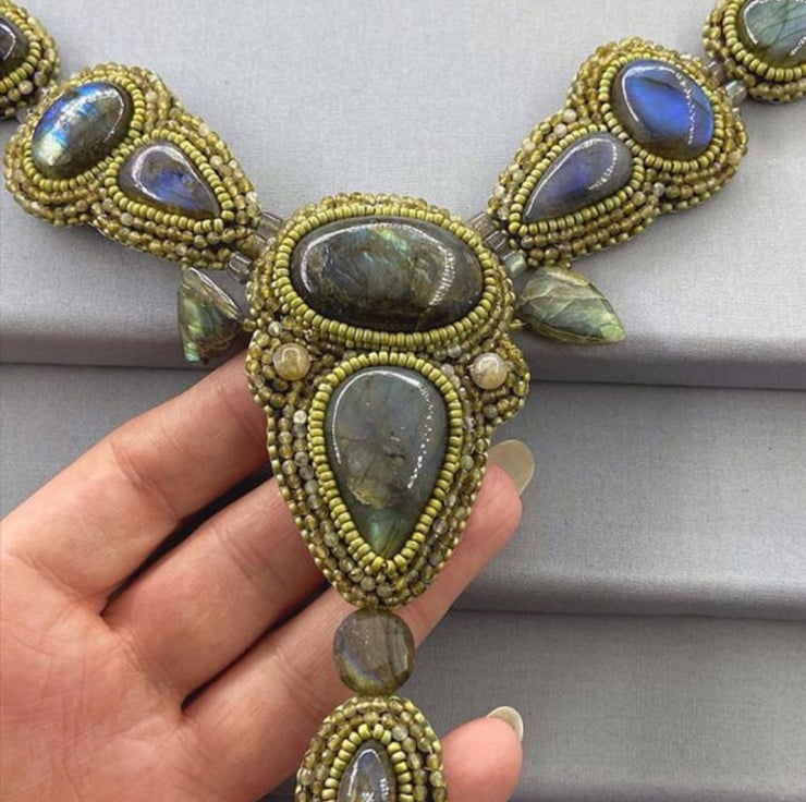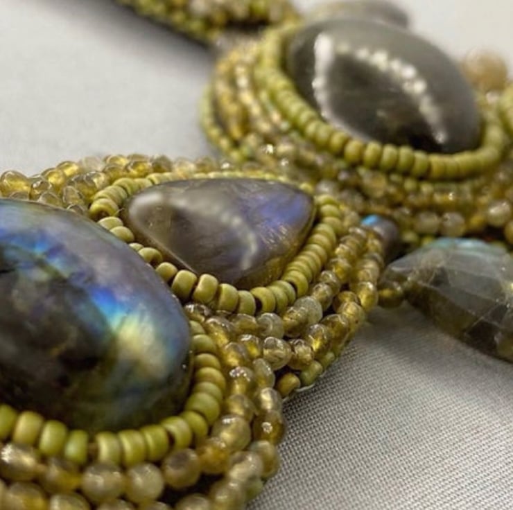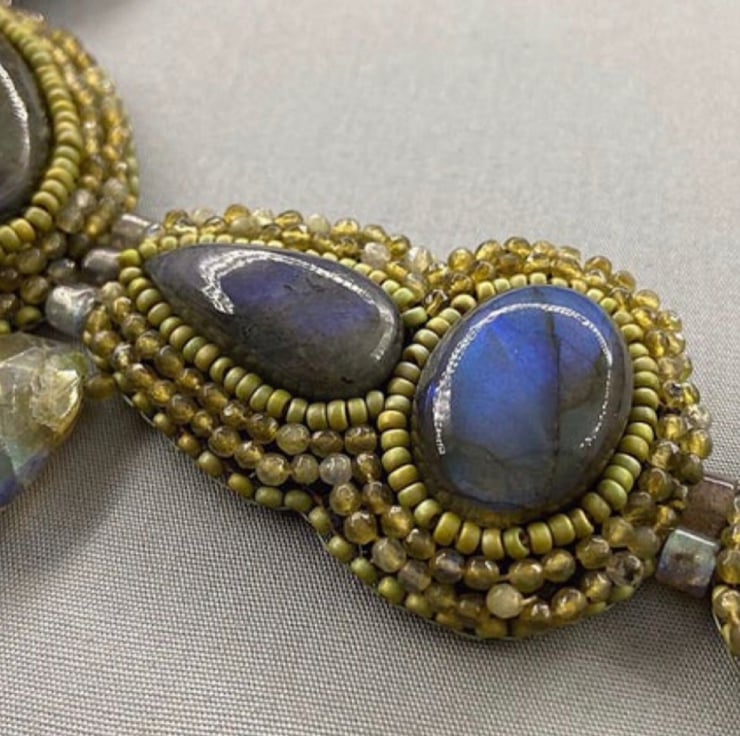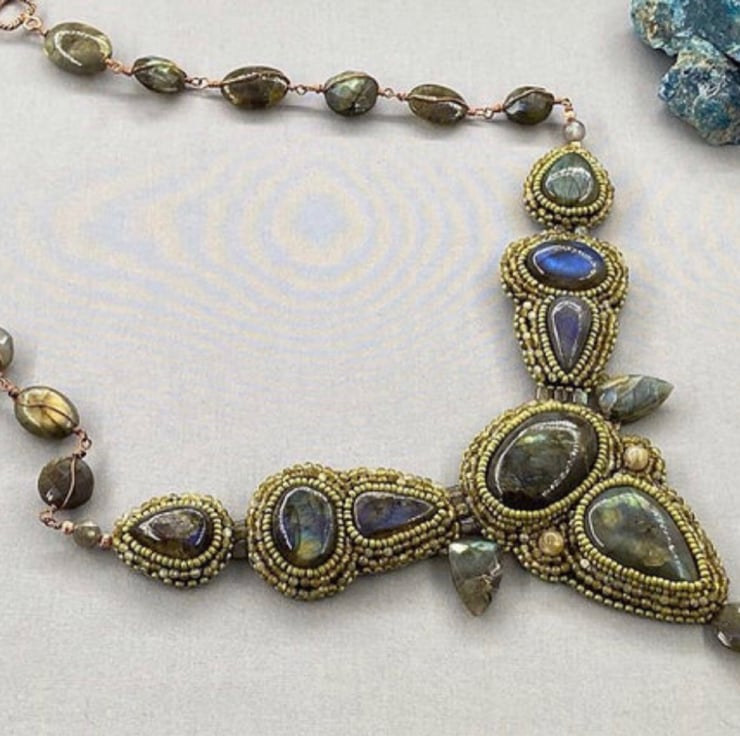 An elegant, beautifully hand stitched beaded , wire wrapped necklace that’s encrusted with the stunning gemstone that is Labradorite, in the style of Art Nouveau. An ideal keepsake gift for any woman who loves statement jewellery.