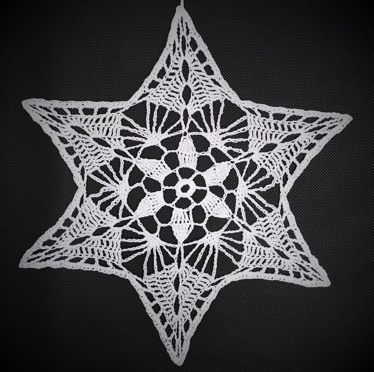 I crocheted this star from cotton thread and then stiffened it with craft glue. I have added a cotton chain to hang it from, and I will include a small suction pad so that t can be attached safely to a window.
