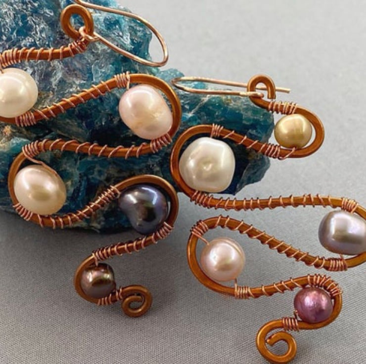 There is also a matching necklace which is now listed in my folksy shop. Here’s the link - https://folksy.com/items/7798920-Quirky-Multicoloured%20Cultured%20Pearl%20Copper%20Abstract%20Squiggle%20Necklace