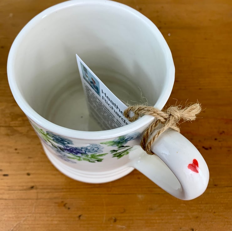 This is a hand cast high fired earthenware mug produced by me in my South Norfolk Studio. This shape is one of our favourites at home as it holds 3/4 pint. this mug stands 10cm tall and is signed and back stamped. I attach a makers card to the handle with jute string.