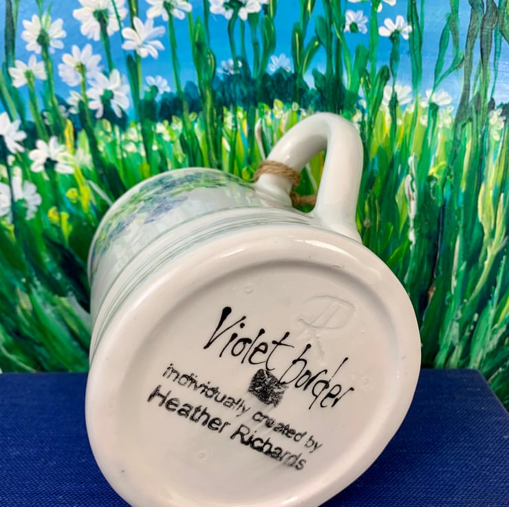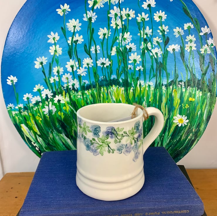 I am a bit of a 'garden-aholic' and love blue flowers. this is a slight departure to my usual style of hand painting, these are stamped on in underglaze colours making a pretty border of blue violets.