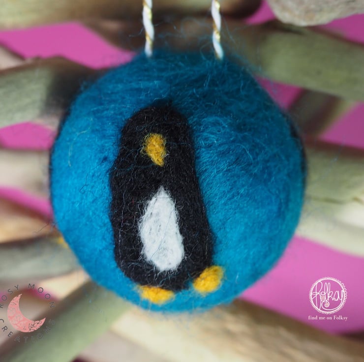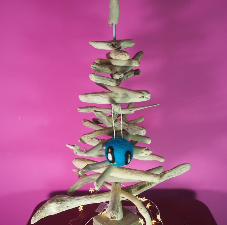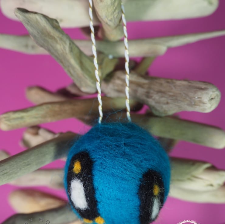 This handmade bauble is made form wool felt over a lightweight ball and measures approximately 5cm. The bauble is hung by a length of gold and white twine.