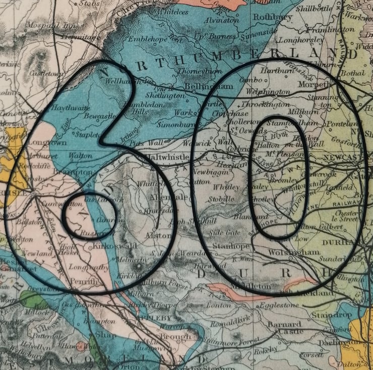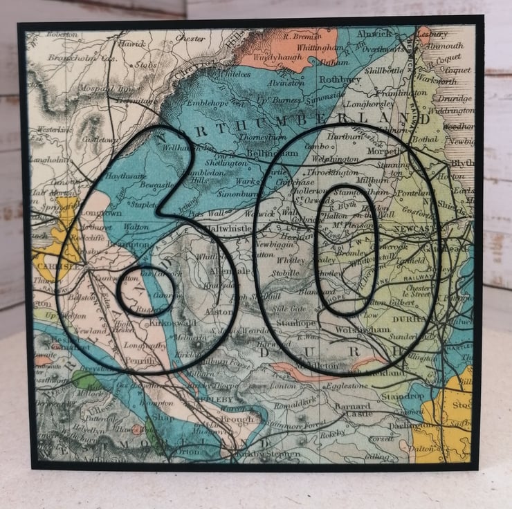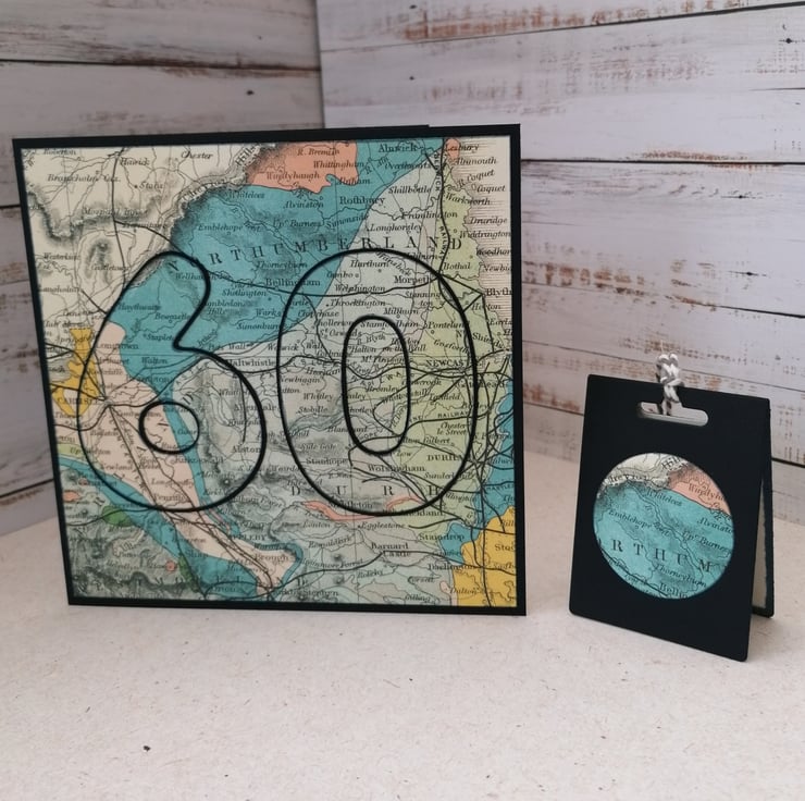 A vintage style map of the North East of England on a navy card base. 60 is pattern matched to background and has a narrow navy border. Matching gift tag and envelope included.