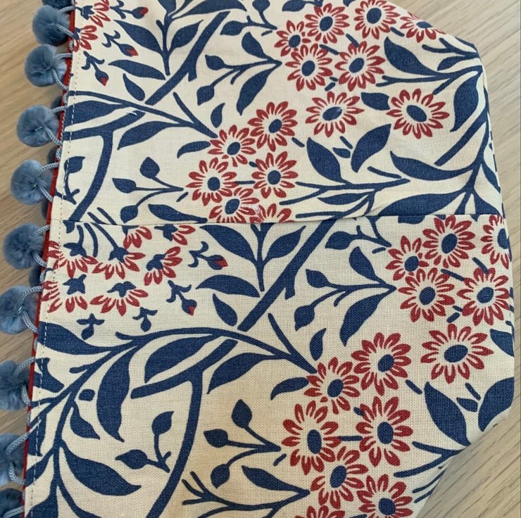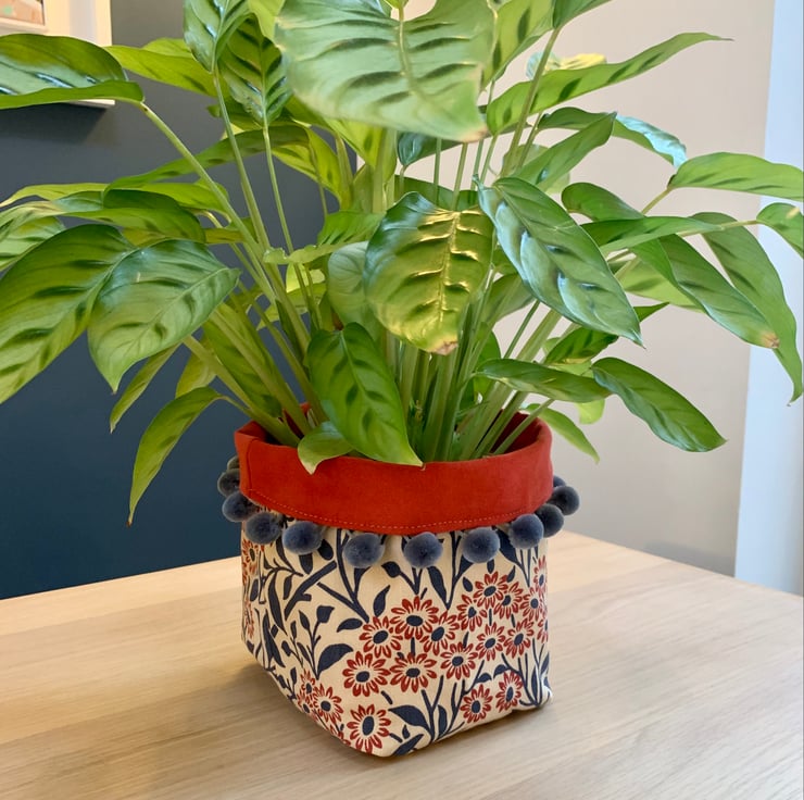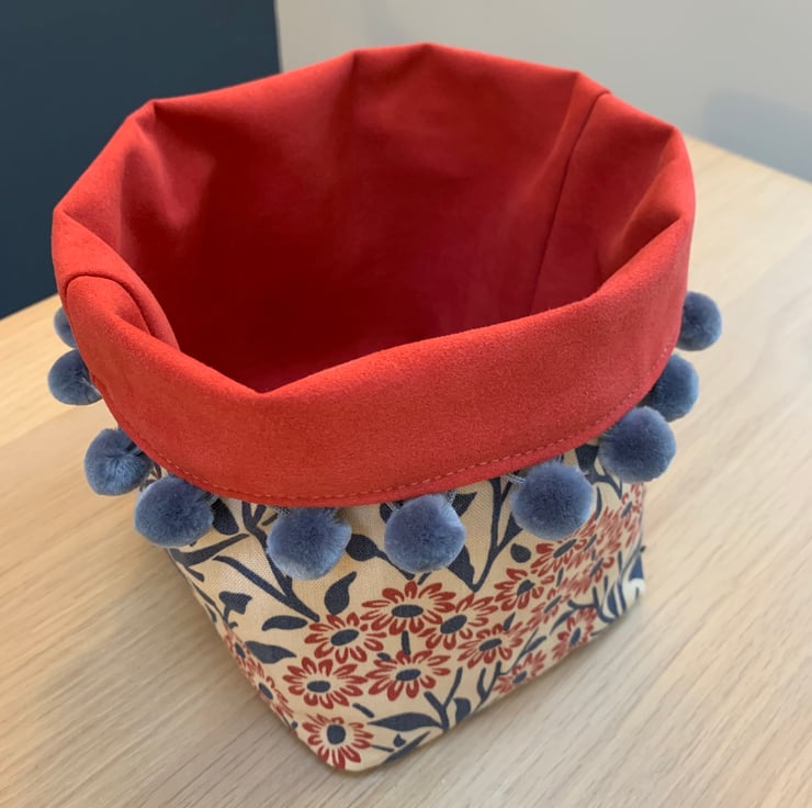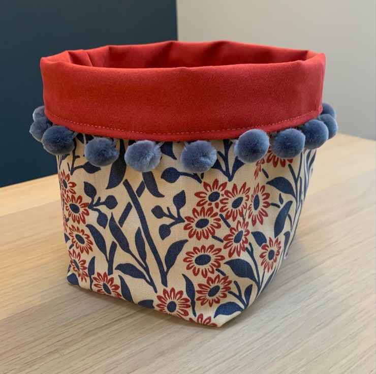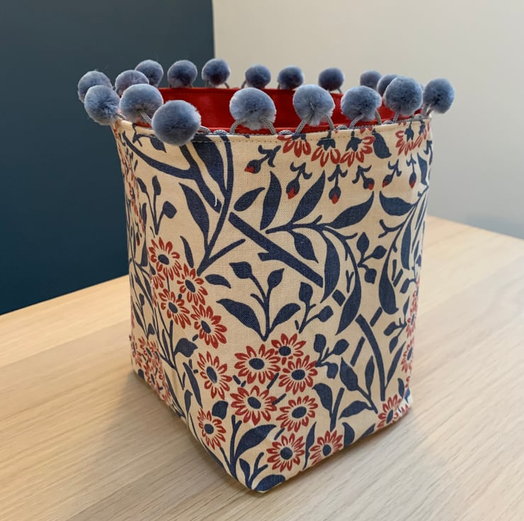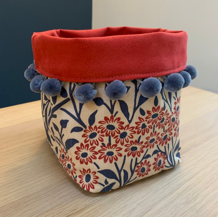 Reversible fabric storage basket made from reclaimed Morris & Co Michaelmas Daisy curtain fabric and soft red faux suede. The edge is trimmed with velvety blue-grey pompoms. Can be used with a turn-down to make the most of the contrasting fabrics.