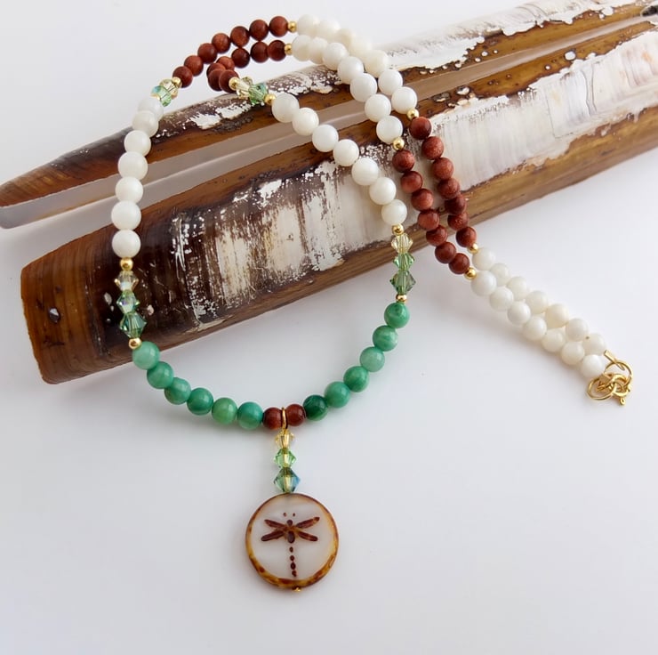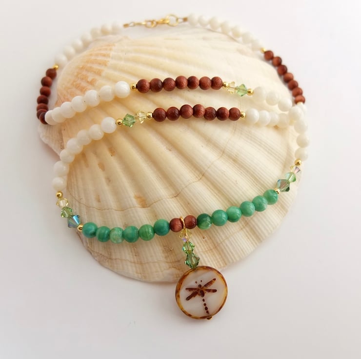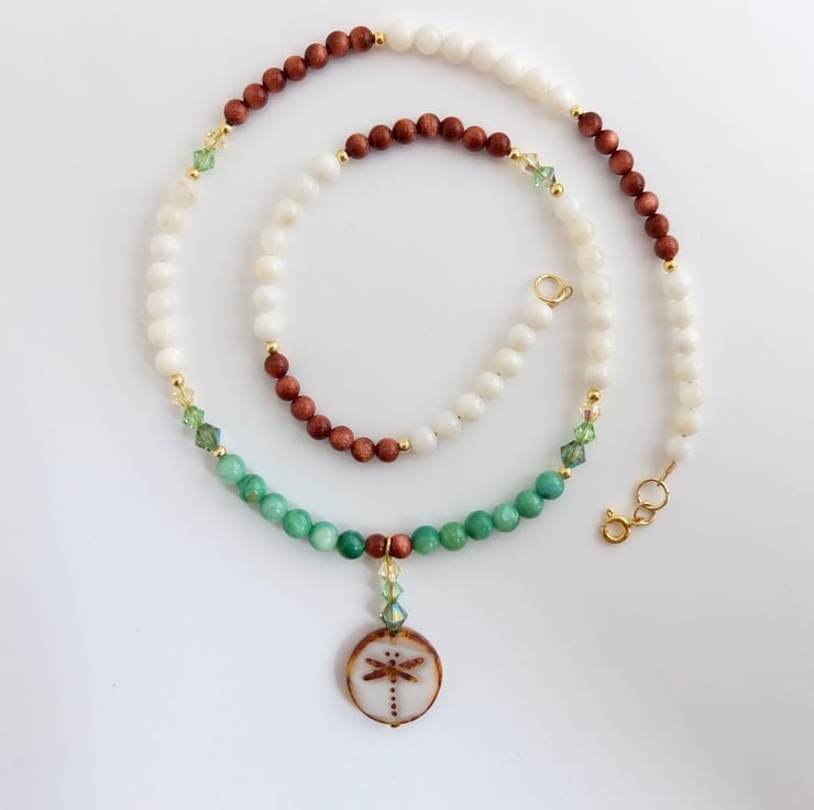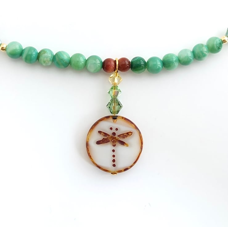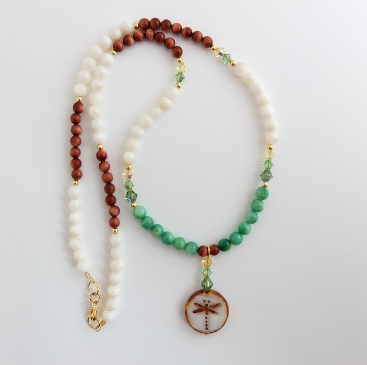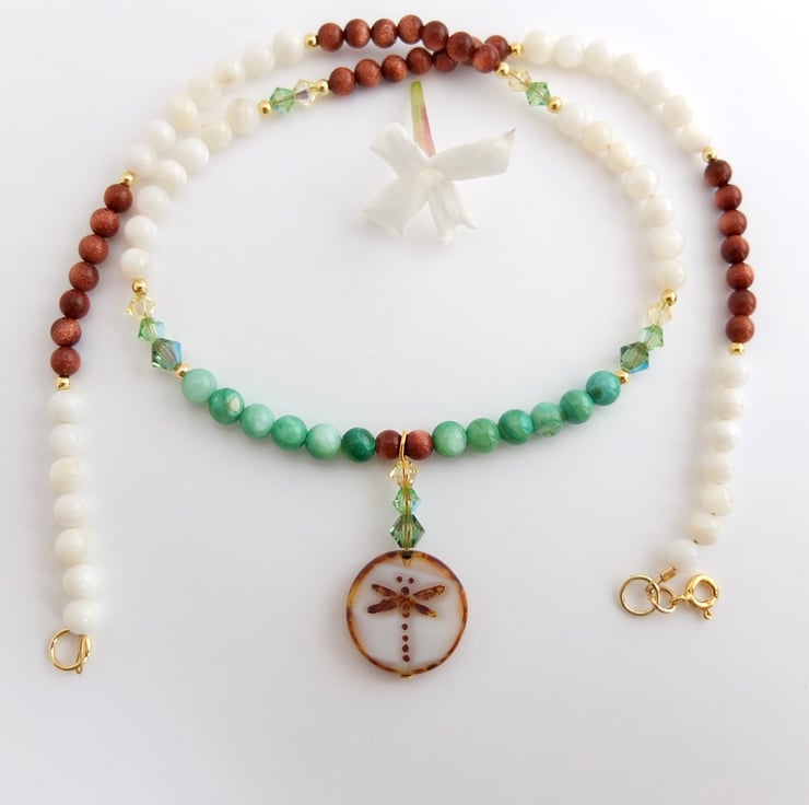 The necklace is made of shimmering goldstone beads, white and green shell beads, and more Swarovski crystals for extra sparkle.