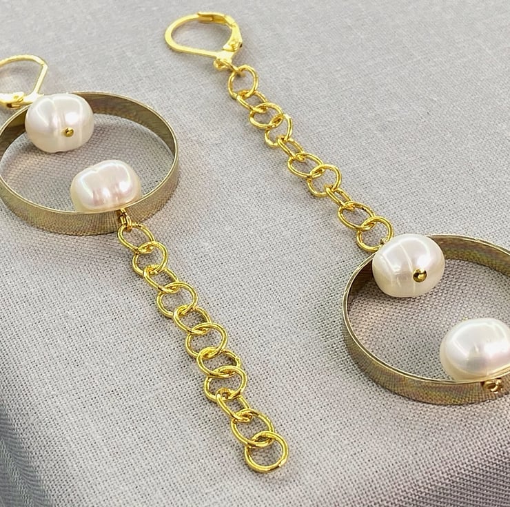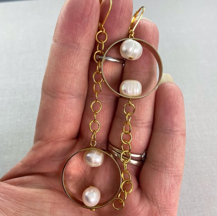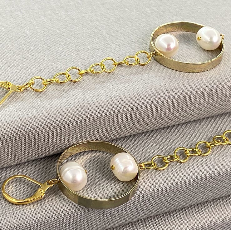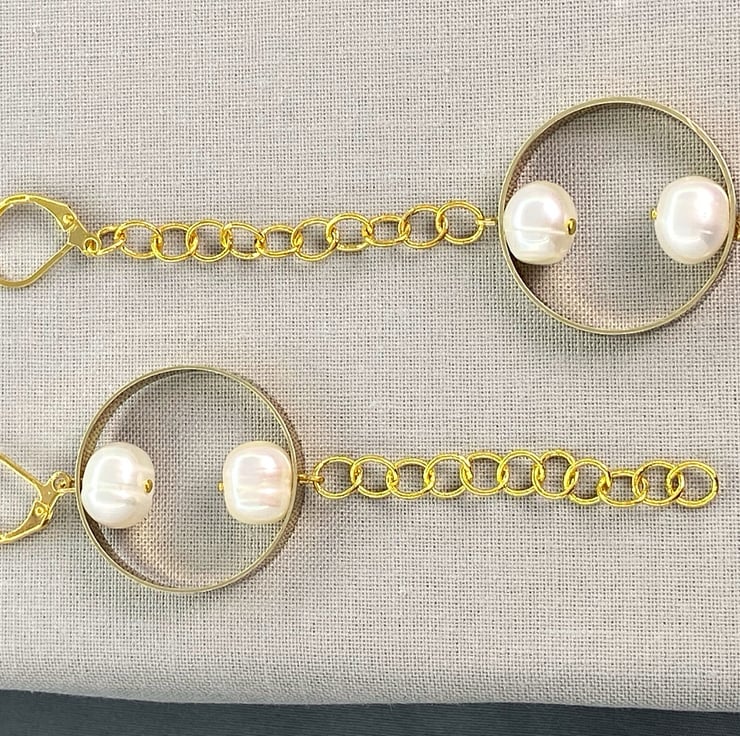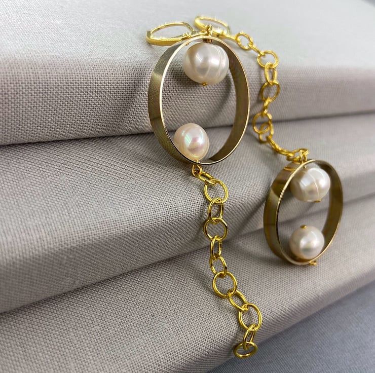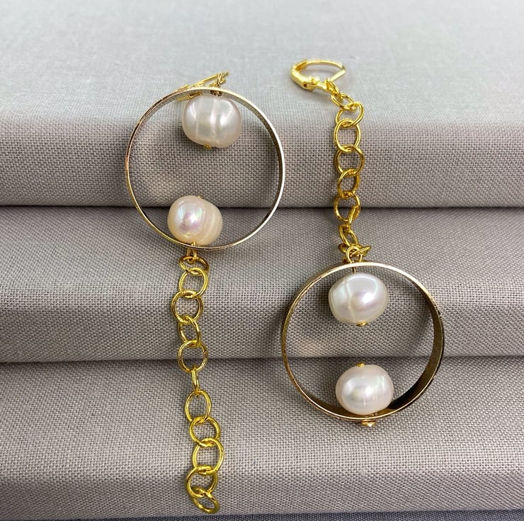 A very modern and cleverly designed pair of earrings created in an asymmetrical style which features cultured pearls which look as though they’re balancing on hoops with additional chain to complete the look.