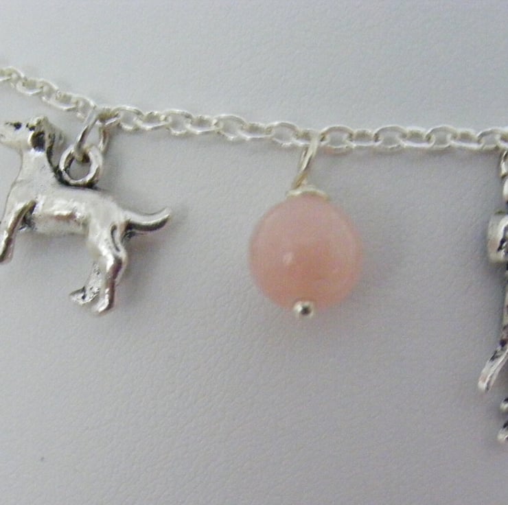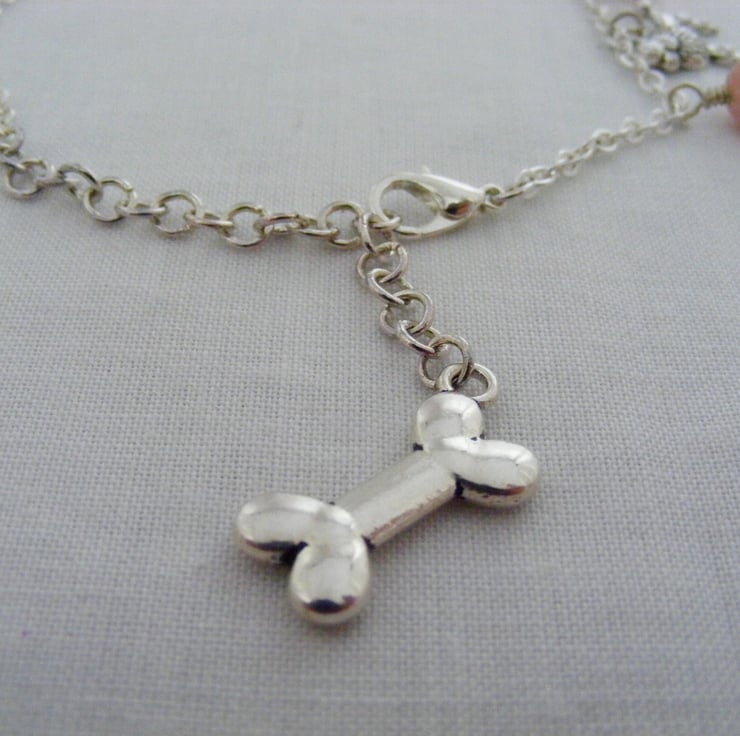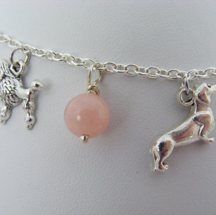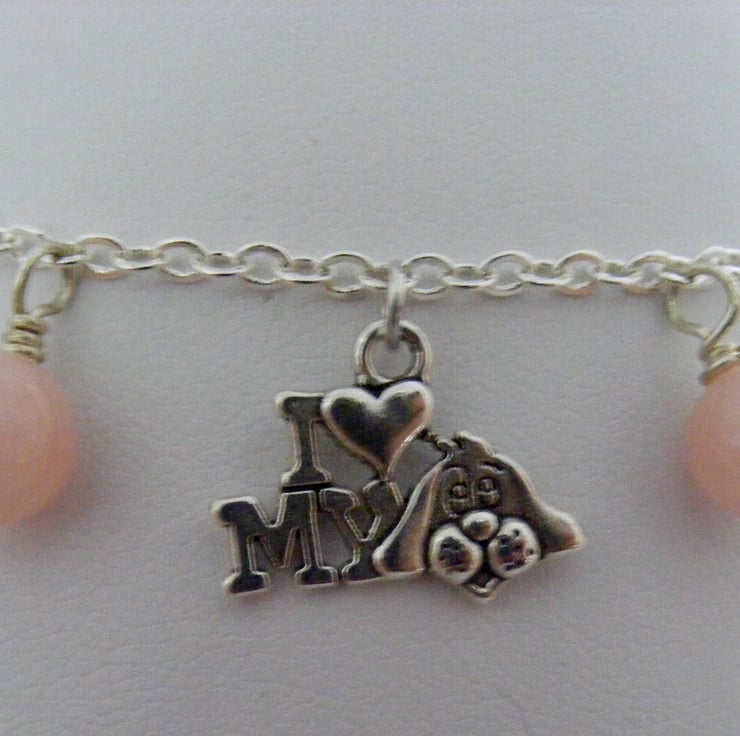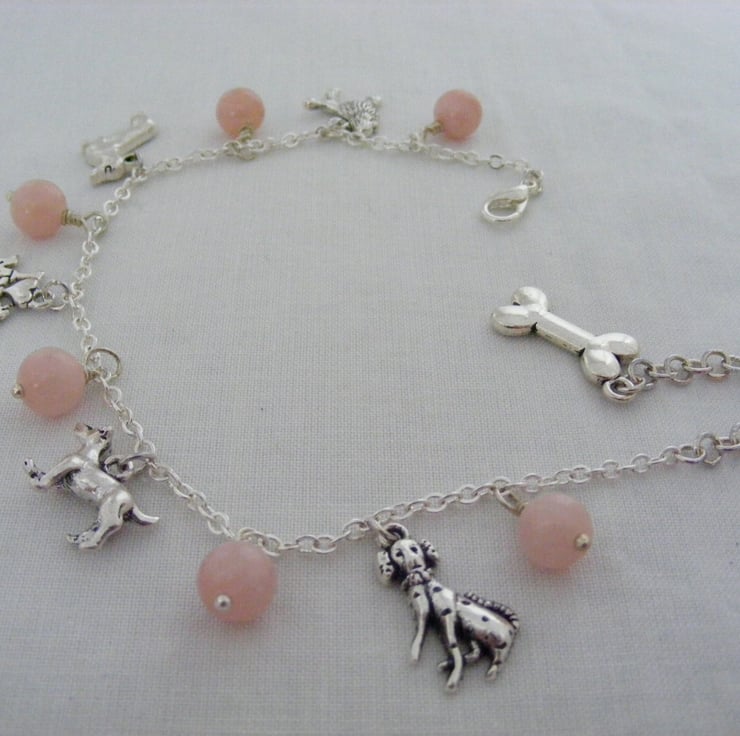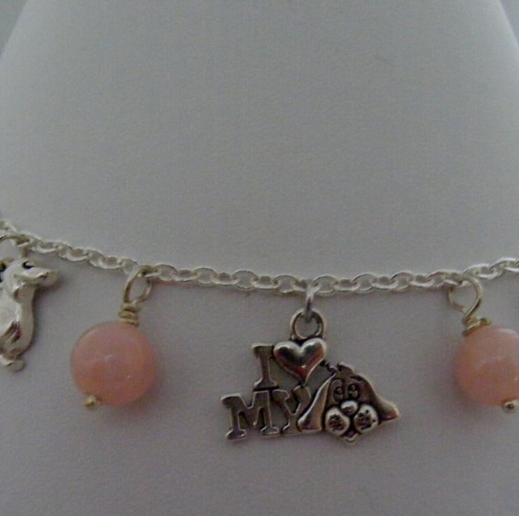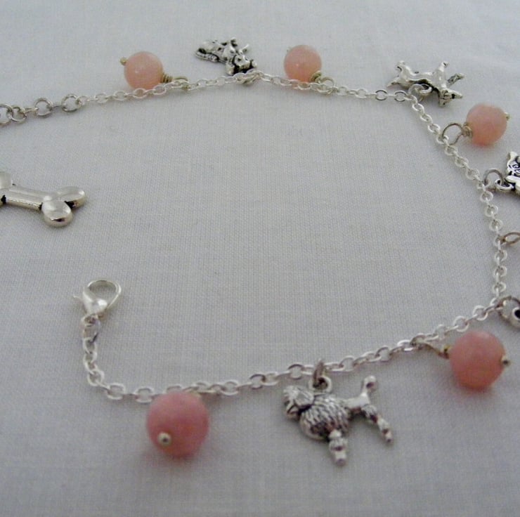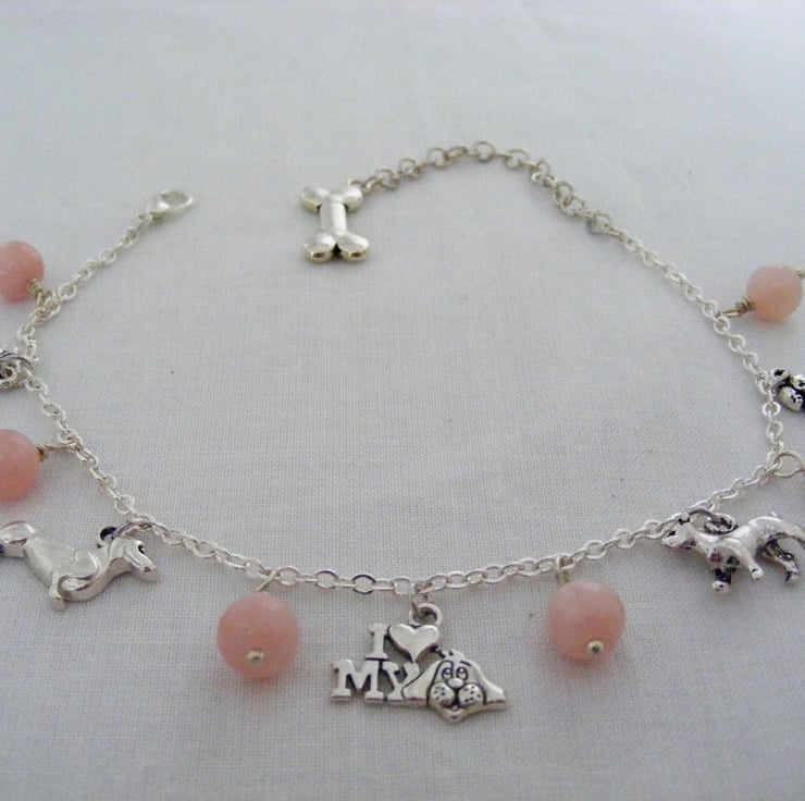 I've handmade this pretty anklet with, 8 mm nude colour jade gemstone rounds, 15 mm silver plated poodle charm, 20 x 18 mm silver plated dalmation charm, 20 x 12 mm silver plated dashound charm, 17 x 10 mm silver plated dog charm, 20 x 8 mm silver plated bone charm, 18 x 10 mm I love my dog charm, silver plated headpins, chain, lobster clasp and extension chain.