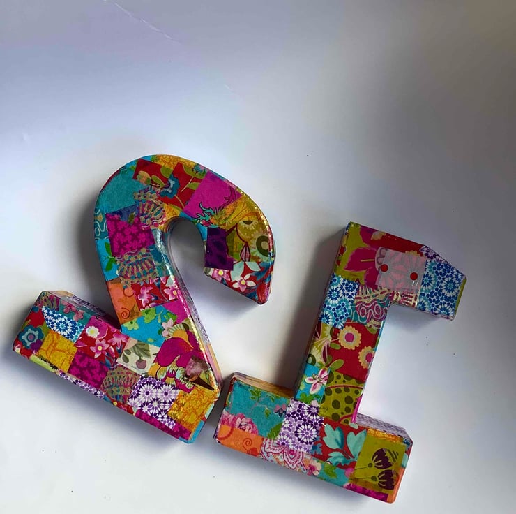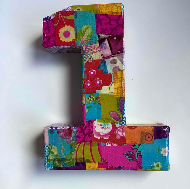 Made of papier-mâché these numbers have been decopatched in an assortment of brightly coloured papers and then varnished.