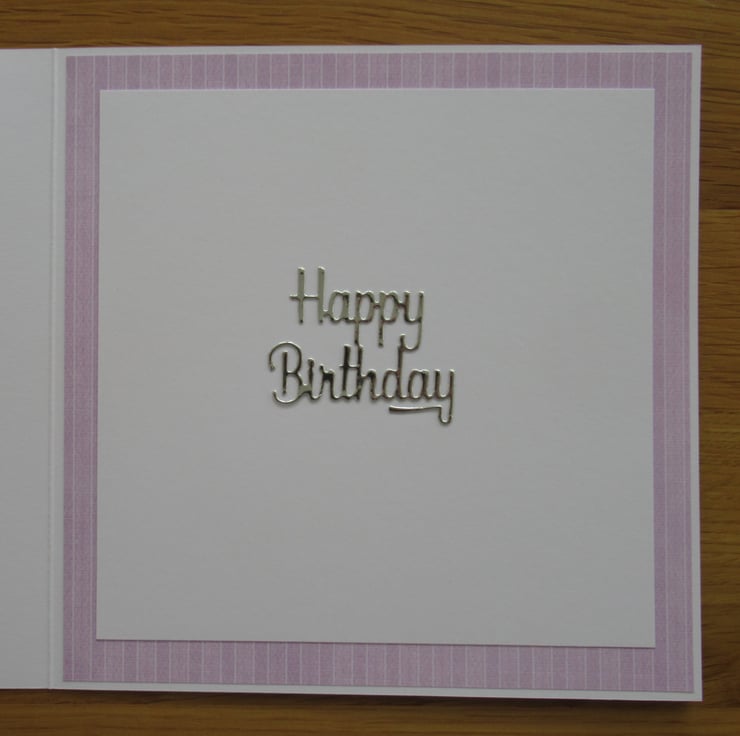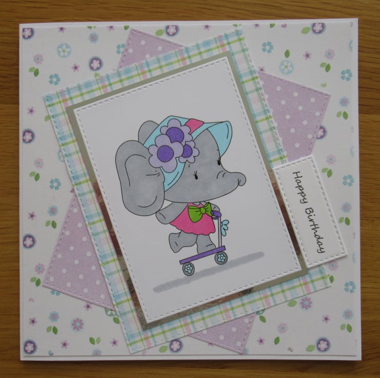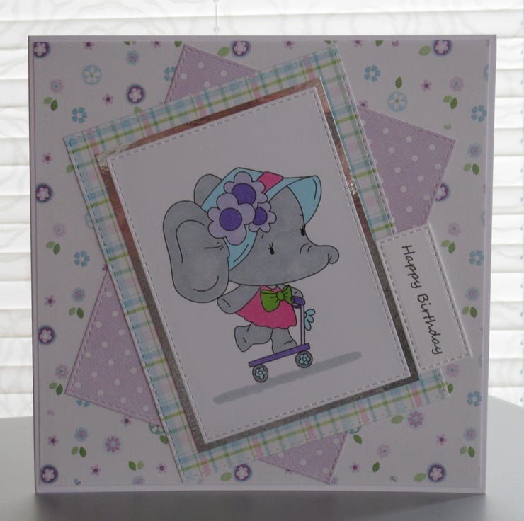This lovely image of Agnes the elephant on her scooter has been printed then hand coloured by me, to coordinate with the backing papers. The image has been cut using stitched edge rectangular dies to create a framed effect and these sit upon several different patterned background papers. Silver foil card has been used for that touch of sparkle and the inside of the card is finished to coordinate with the front.