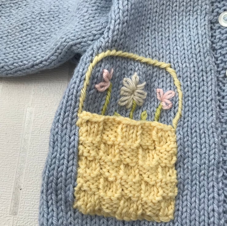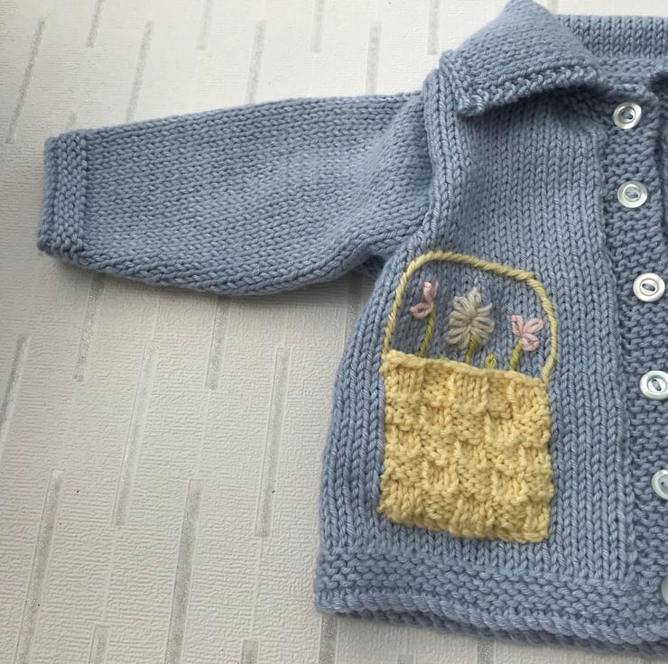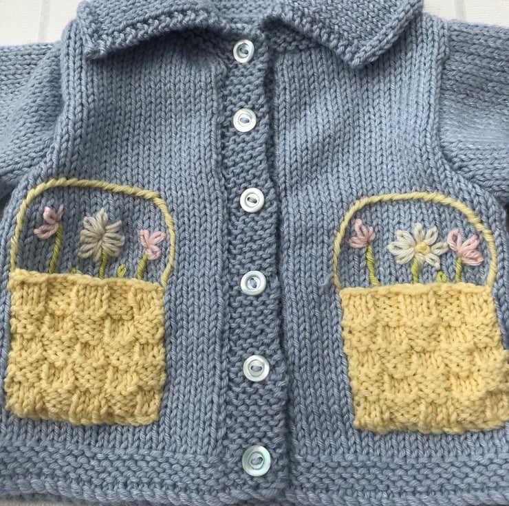A hand knitted cardigan worked in a luxury wool and silk yarn. The front of the cardigan has two pockets knitted as baskets containing embroidered flowers. It has a collar and fastens at the front with 6 pearly buttons.