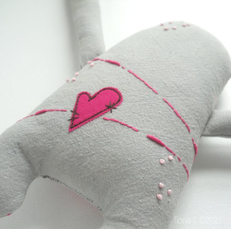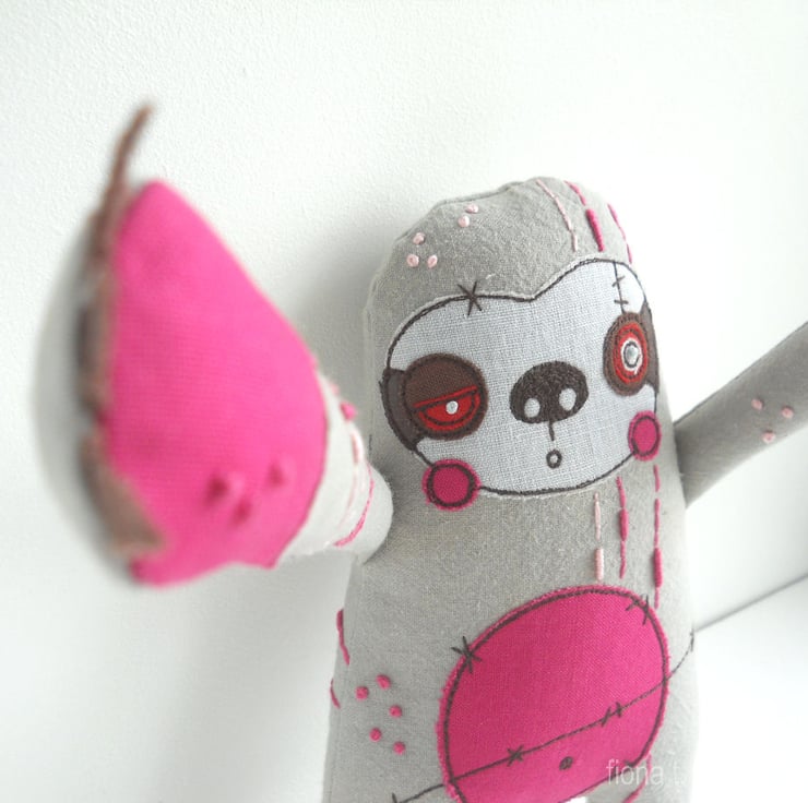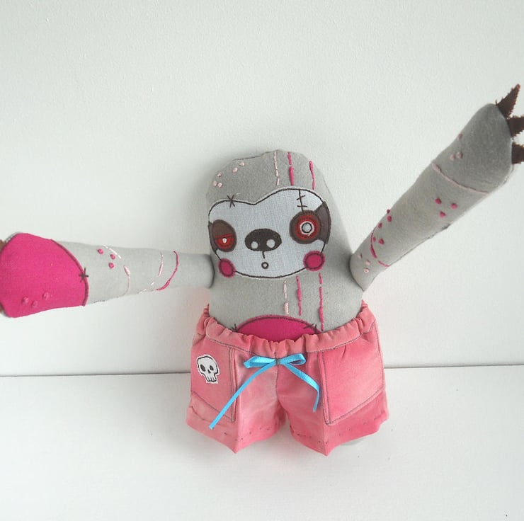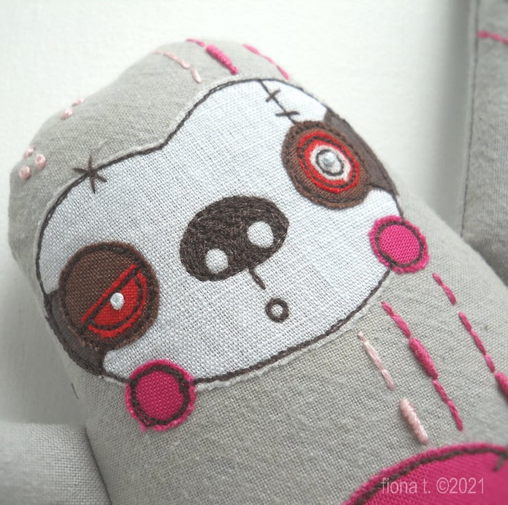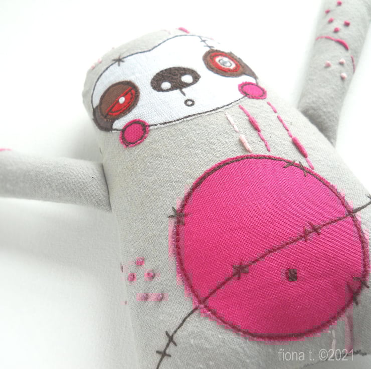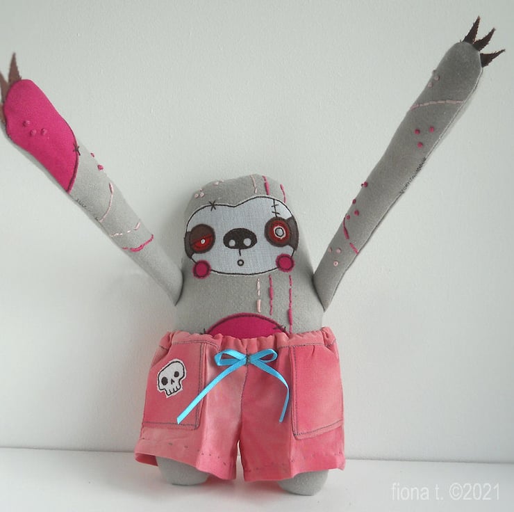 silk pyjama wearin’ zombie sloth - applique, free motion & hand embroidered, size miniature big-ish - hot pink.