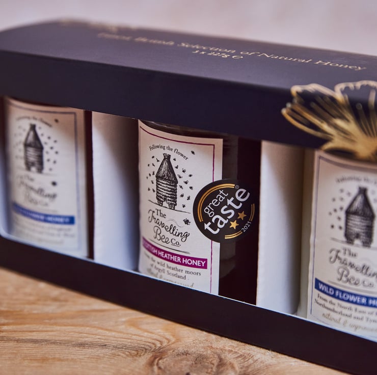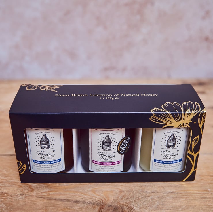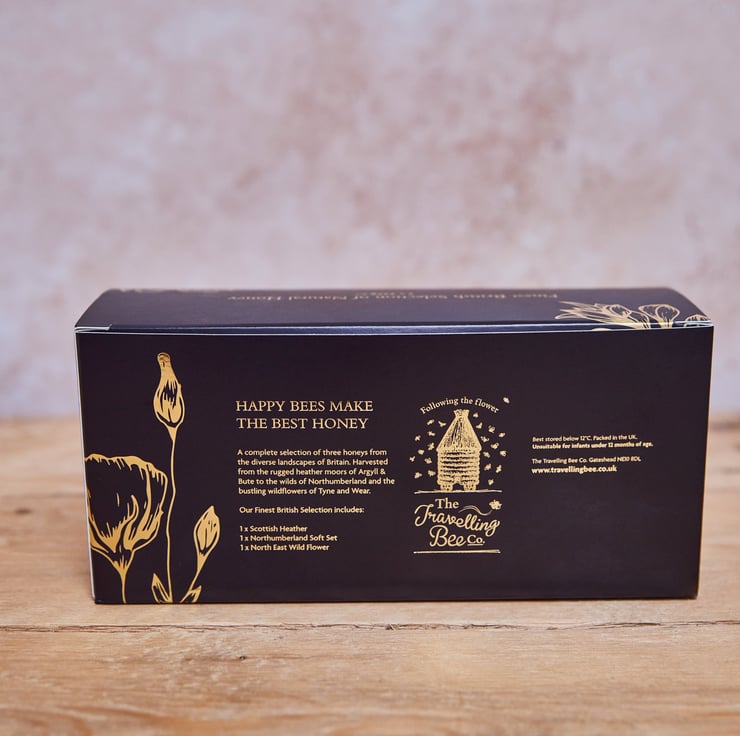 These are from our bees, harvested from the rugged heather moors of Argyll & Bute to the wilds of Northumberland and the bustling wildflowers of Tyne and Wear. In a luxury gold foiled gift box set.