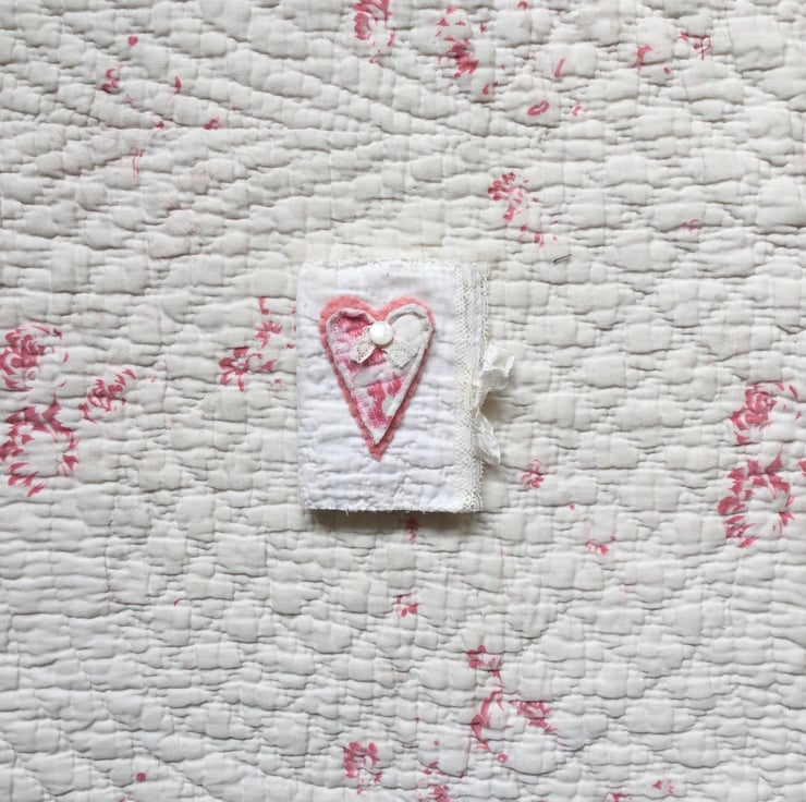 Decorated with a vintage quilt heart, trimmed with further lace and a Pearl button, sitting atop a piece of hand died felt.