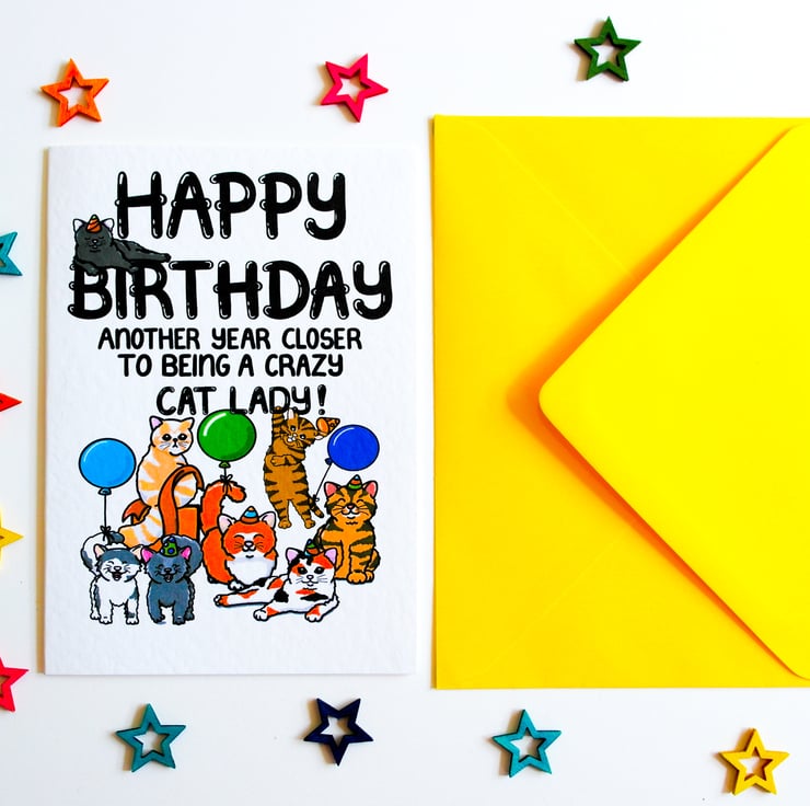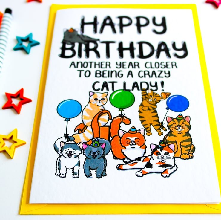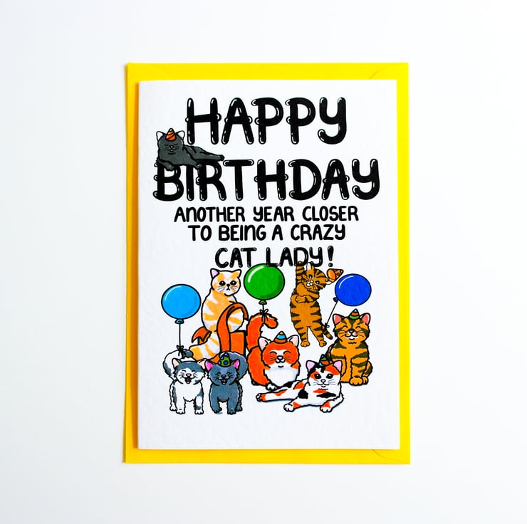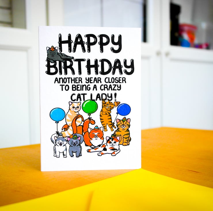 Greeting on front: HAPPY BIRTHDAY ANOTHER YEAR CLOSER TO BEING A CRAZY CAT LADY!