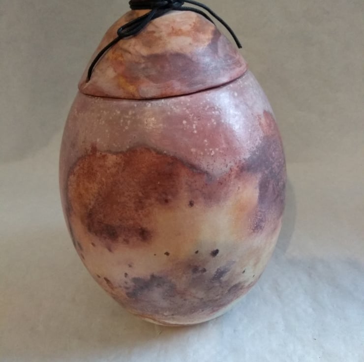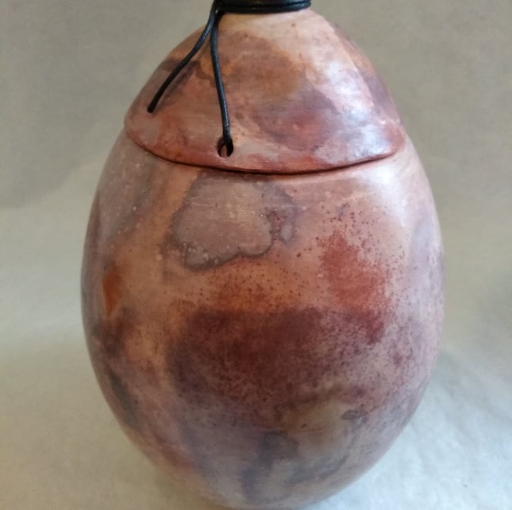 THIS DECORATIVE URN COULD BE USED TO STORE ASHES. IT IS BIODEGRADABLE AND HAS NOT BEEN GLAZED INSIDE. UNIQUE SURFACE PATTERNS DUE TO FERRIC CHLORIDE USED PRIOR TO A FIRING IN A GAS KILN
