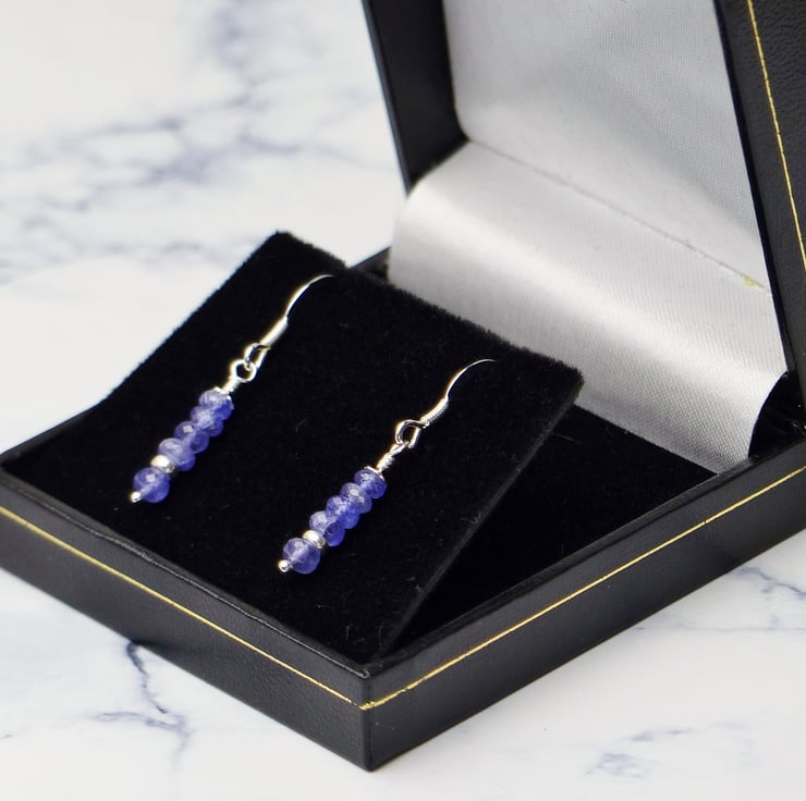 These petite genuine tanzanite drop earrings are versatile and easy to wear and would make a lovely December birthstone gift. The Tanzanite gemstones are AA quality with a gorgeous blue violet colour and a sparkly faceted cut. These handmade tanzanite dangle earrings have sterling silver accent beads that highlight the gemstones for an elegant look.