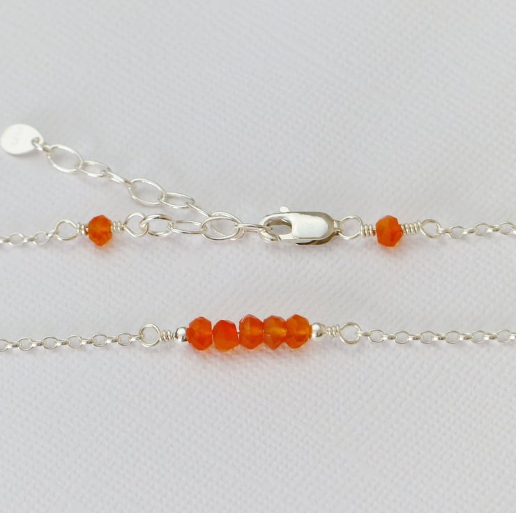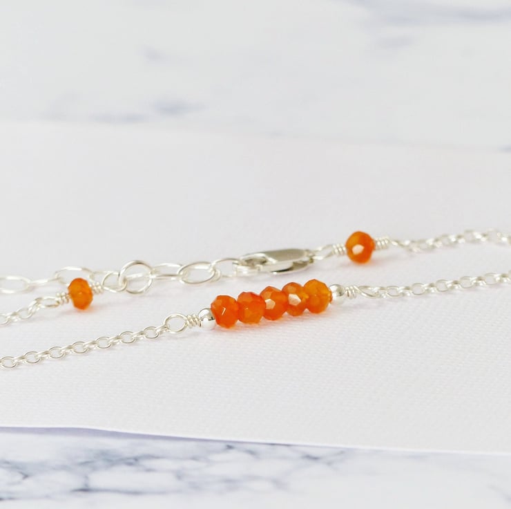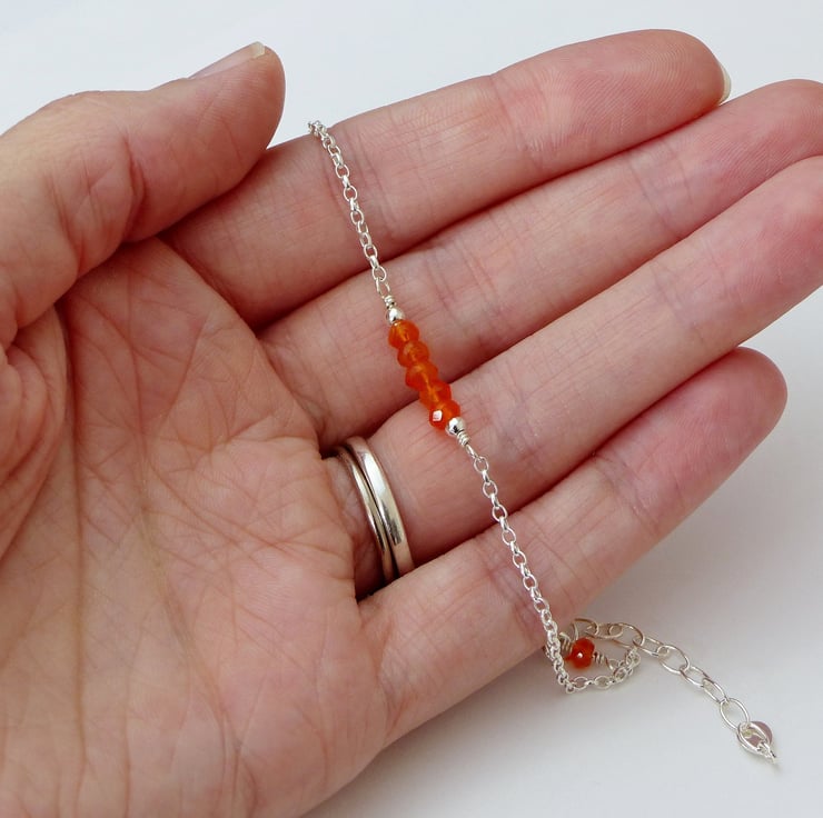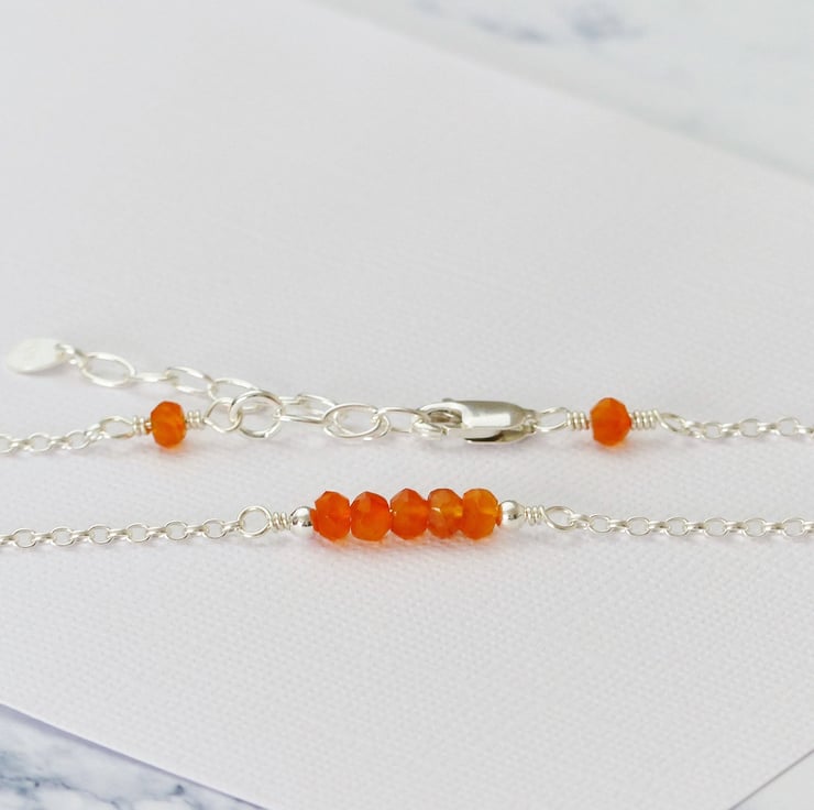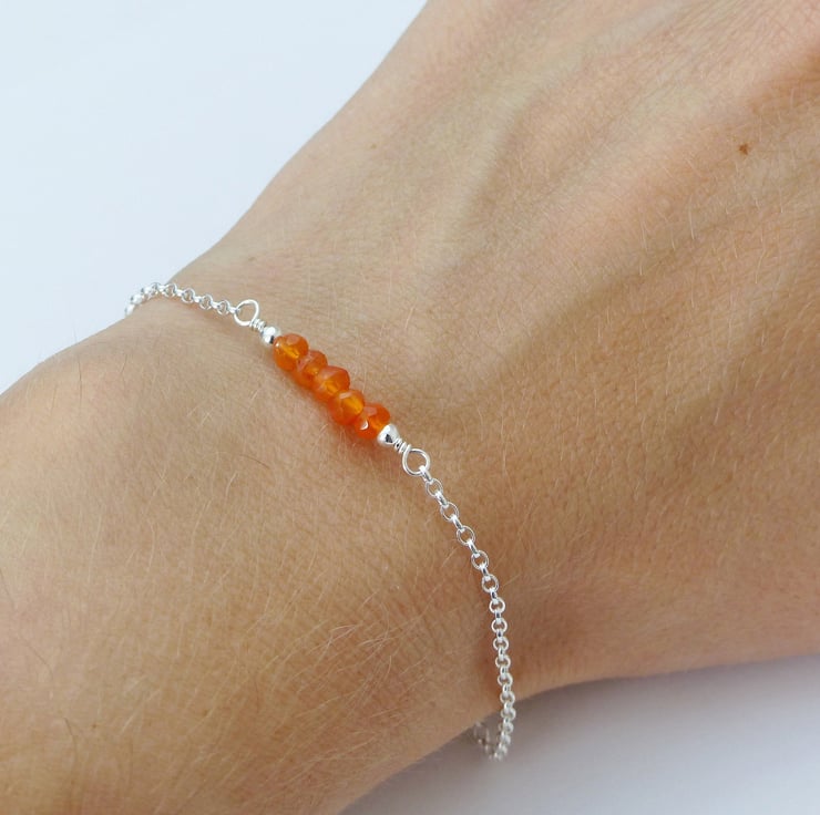 This sterling silver bracelet features natural carnelian gemstone beads with a vibrant orange colour. Each carnelian bead is carefully selected then arranged ino a bar design and wrapped by hand with sterling silver wire onto an adjustable chain, making this a perfect gift.