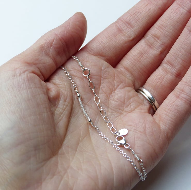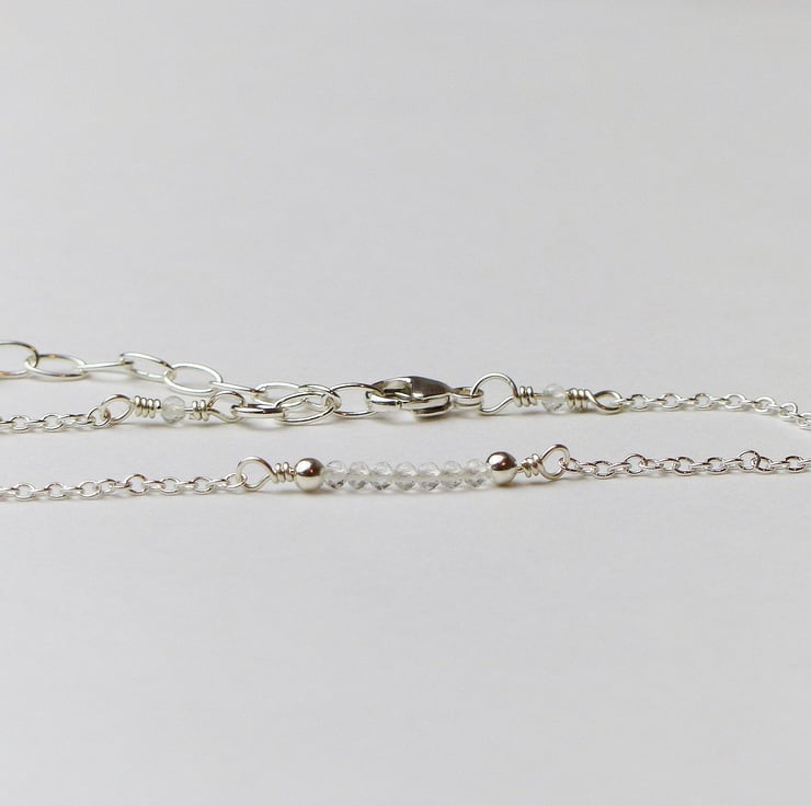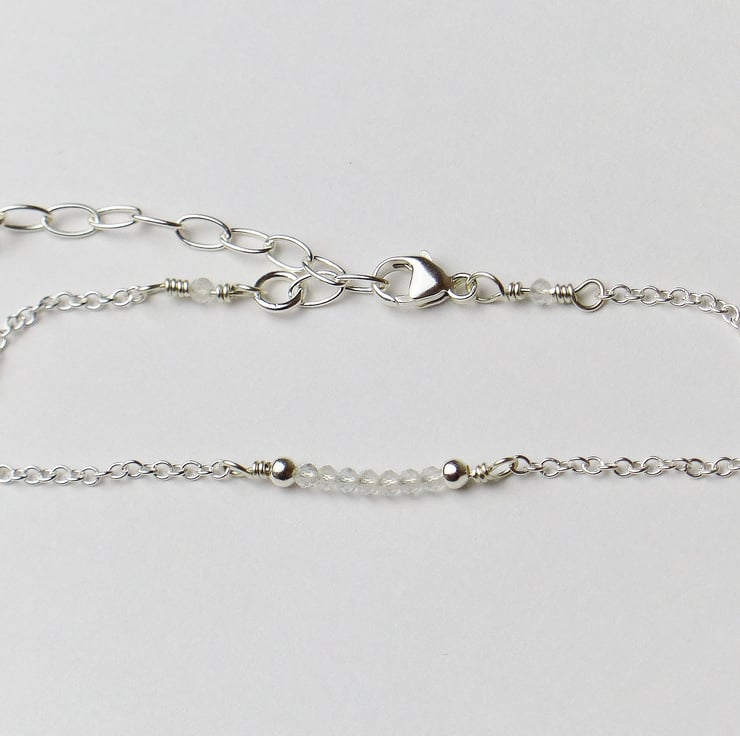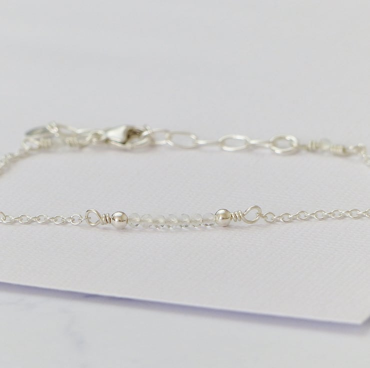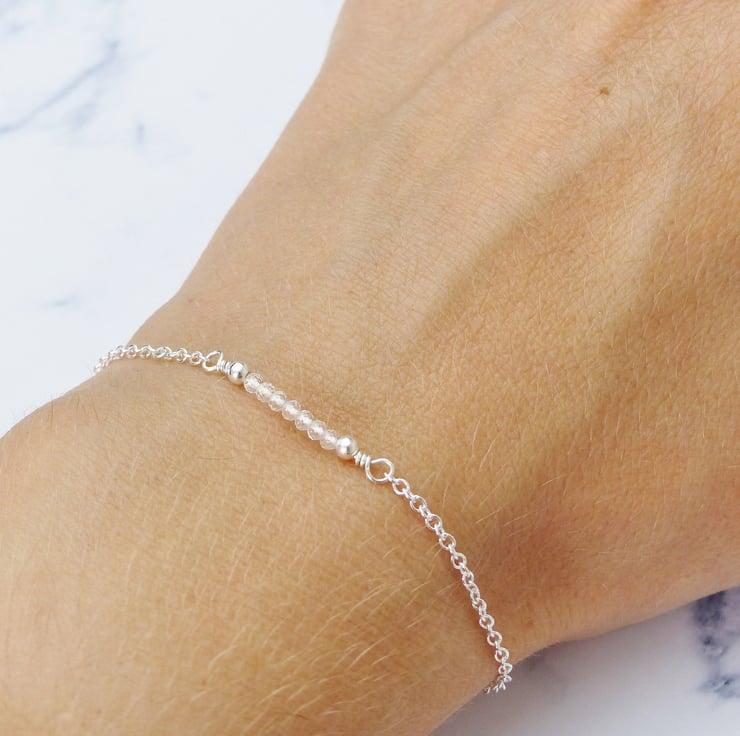 This dainty bead bar bracelet features crystal clear white topaz beads. These natural gemstones are high quality AA grade which means that they have excellent clarity and a beautiful cut so they are very sparkly. Beads are carefully selected then wired by hand with sterling silver wire onto an adjustable chain, and packaged in a jewellery gift box, making this a perfect gift.
