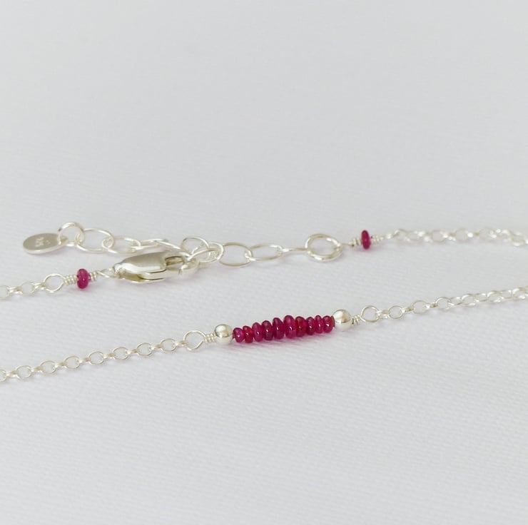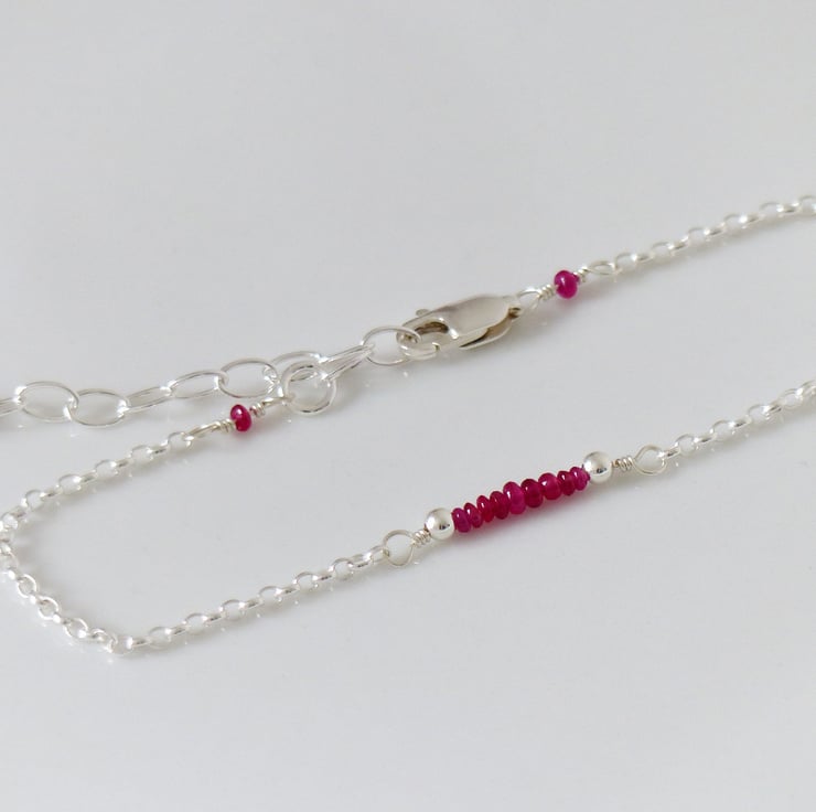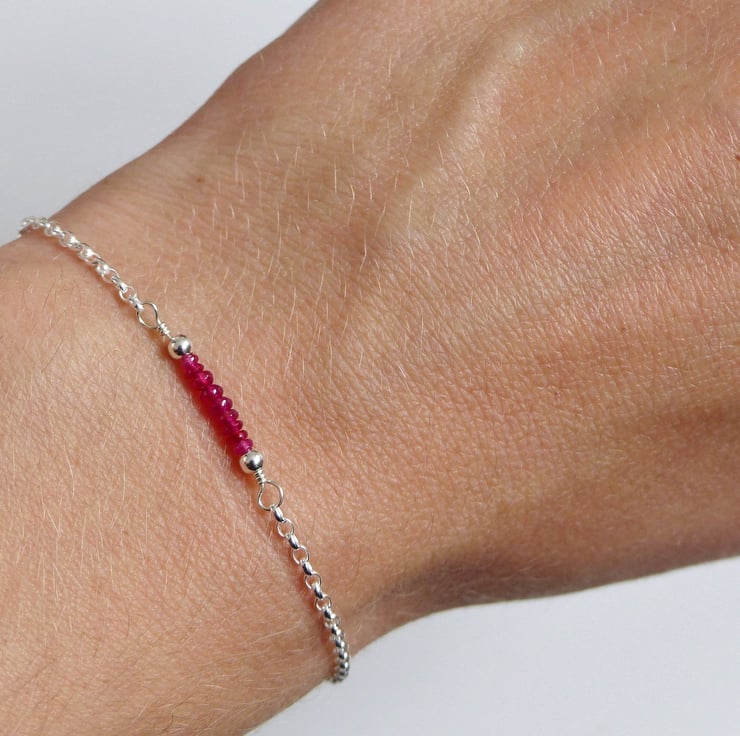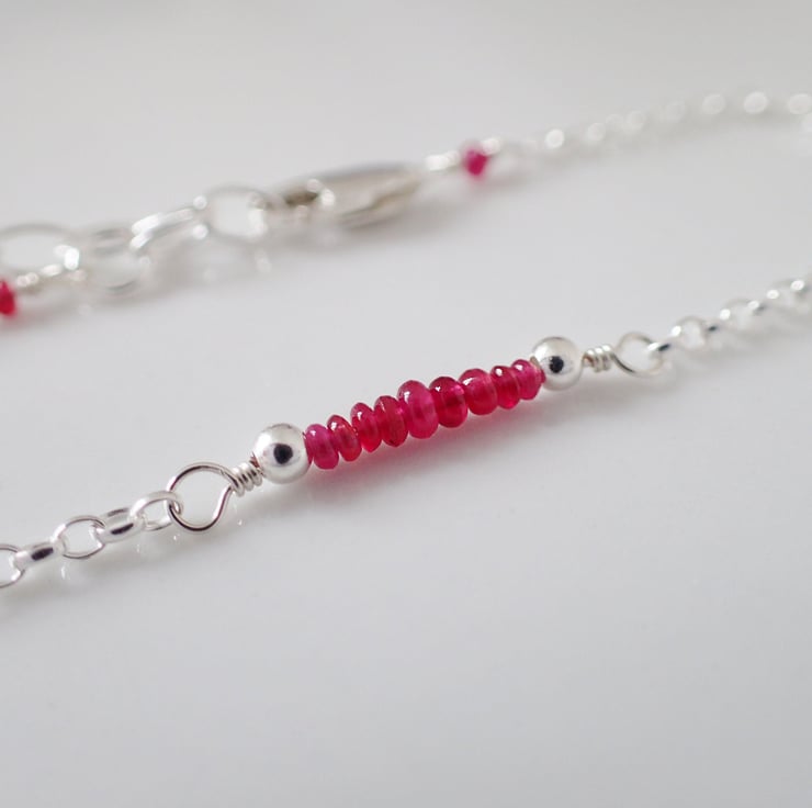 This dainty bead bar bracelet features high quality natural ruby gemstones with a beautiful bright red colour. These gemstones have been carefully selected and wrapped by hand with sterling silver wire onto an adjustable chain, making this a perfect gift.