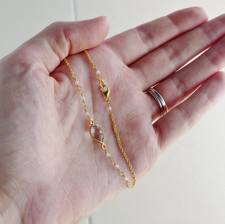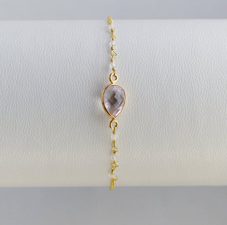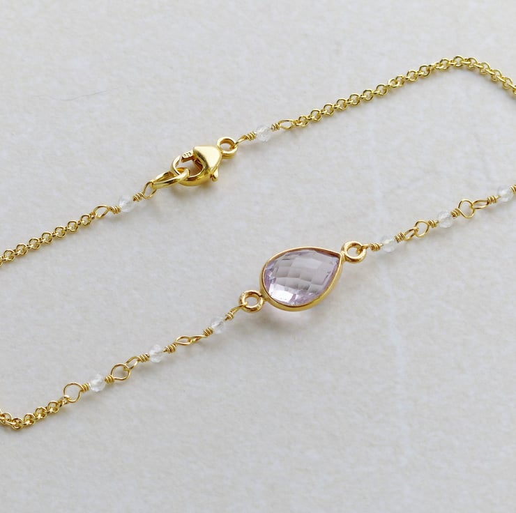 The high quality pink amethyst gemstone is a delicate pastel lilac colour with excellent clarity and is faceted on both sides to sparkle when it catches the light. The tiny natural white topaz beads are also faceted and look beautiful with the amethyst and gold vermeil.
