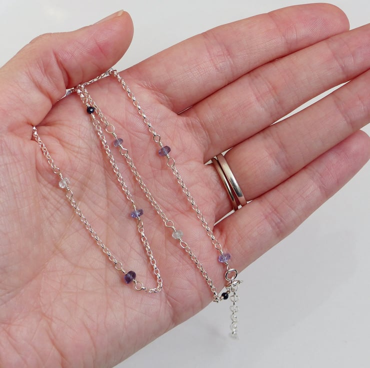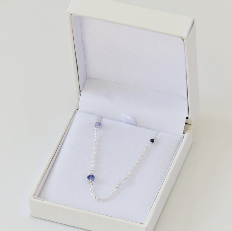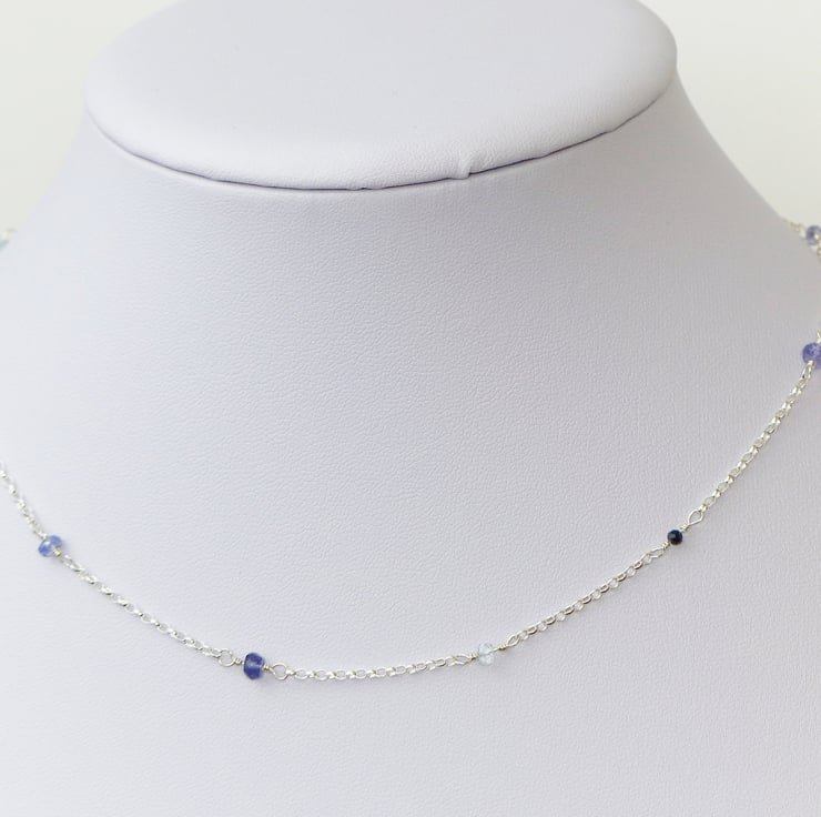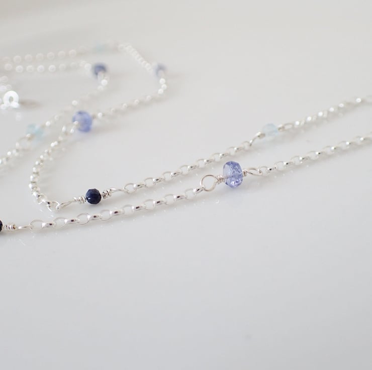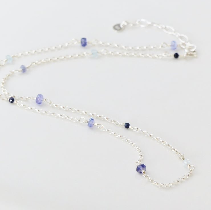 This unique necklace features stunning blue gemstones iolite, sapphire, aquamarine and tanzanite. Each dainty gemstone has been carefully chosen by hand and wire wrapped onto sterling silver chain. The gemstone beads are high quality with a beautiful colour and they are faceted so they sparkle in the light.