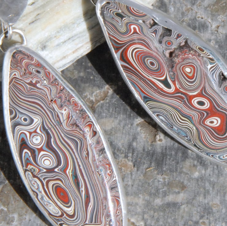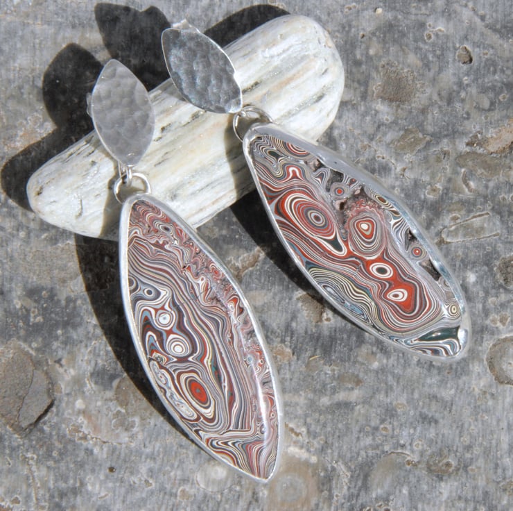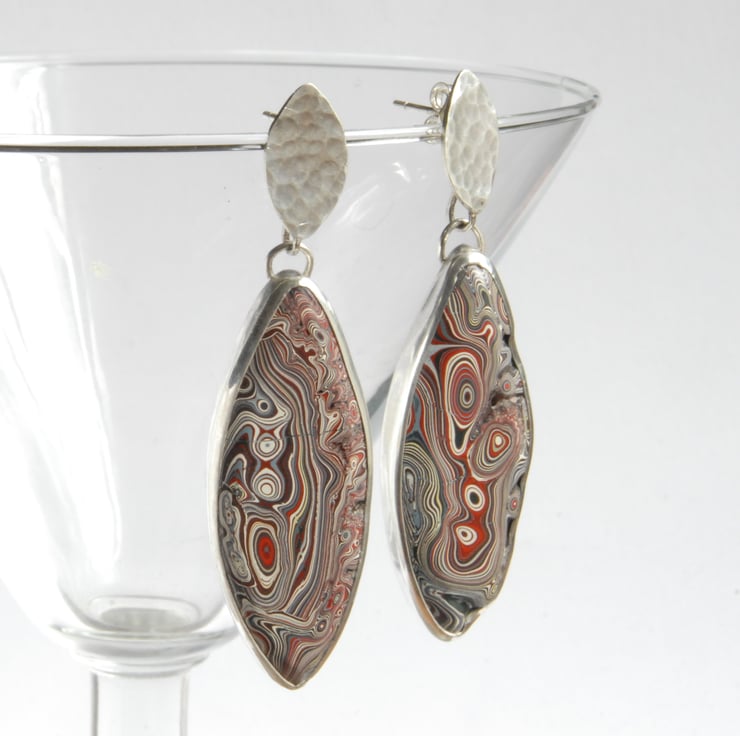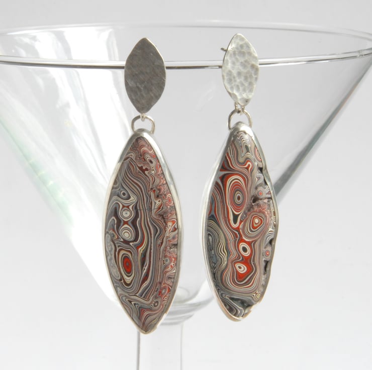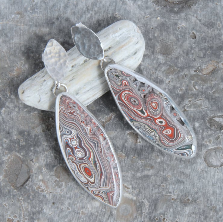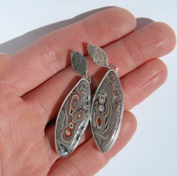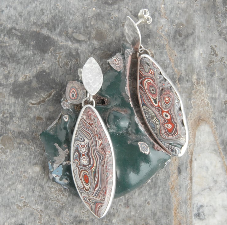 These unique dangle earrings feature marquise shaped drops fordite which has been bezel set in sterling silver and finished off with textured sterling silver stud tops. The fordite has a very swirly pattern in more muted shades of red, creamy white, dark green and a grey blue, the fordite came from the edge of the piece of rough and there are dips in the surface from the unevenness of the rough (you can see the rough in one of the photos - this is not included). This fordite had some cracks in it prior to cutting so I stablised it to make it super strong for cutting, if you look closely you can still see lines where the cracks were but they are largely hidden by the complicated pattern. The earrings measure approx 55mm from the top to bottom by 15mm across (fordite measures 38mm by15mm). Comes gift boxed.