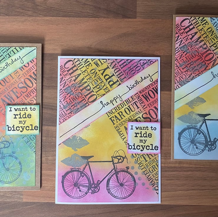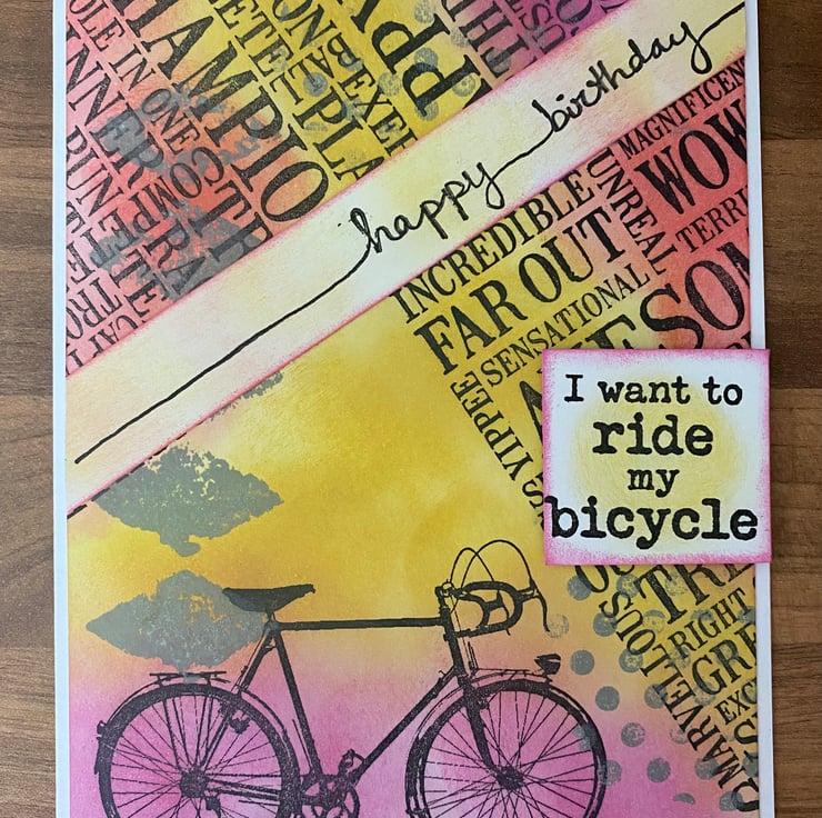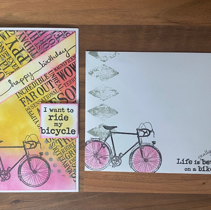 Sentiments "Happy Birthday" and “I want to ride my bicycle” were both stamped in archival ink but edged in the core colour with amber in the centre. The design follows through to the card interior and envelope.