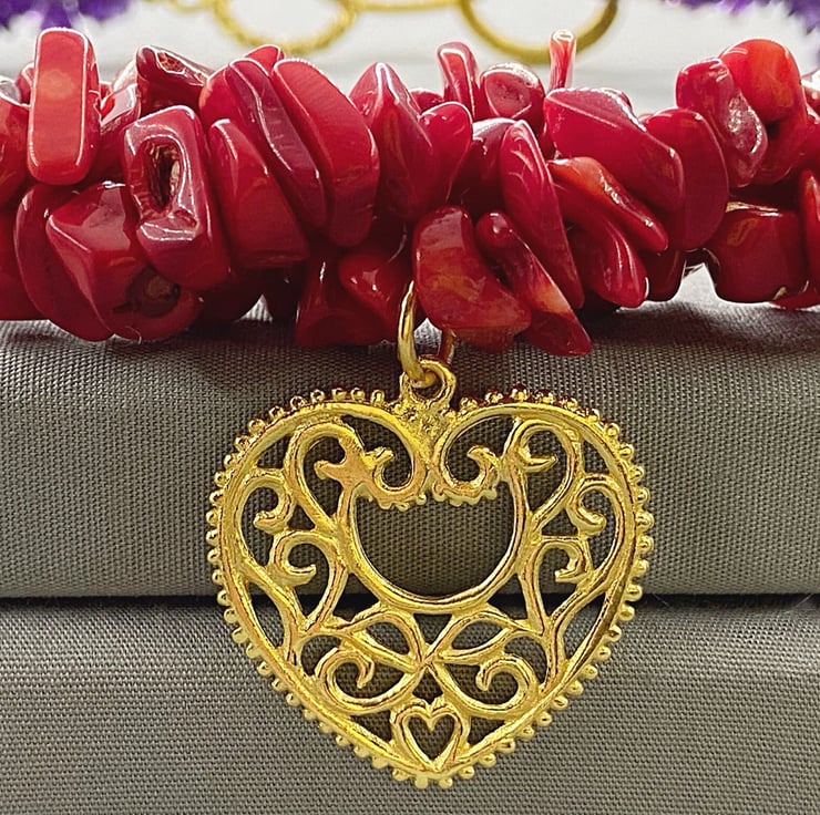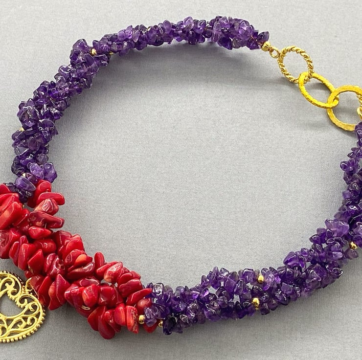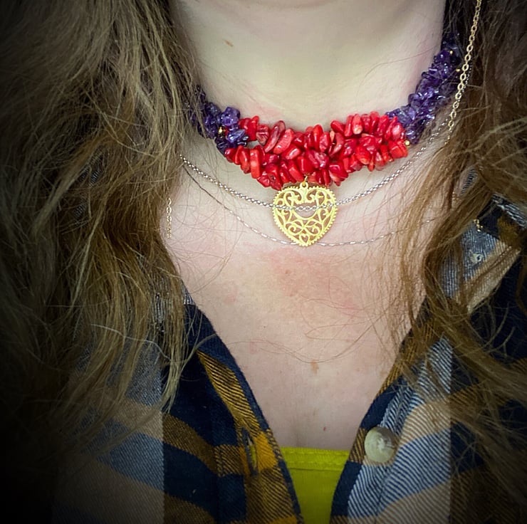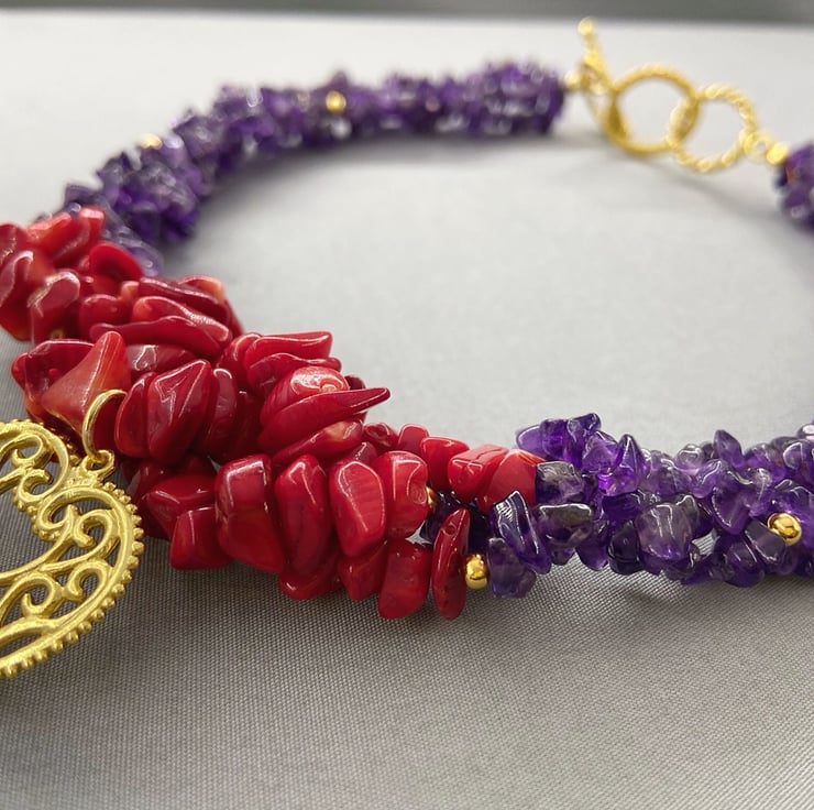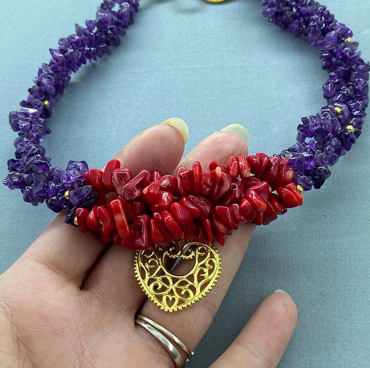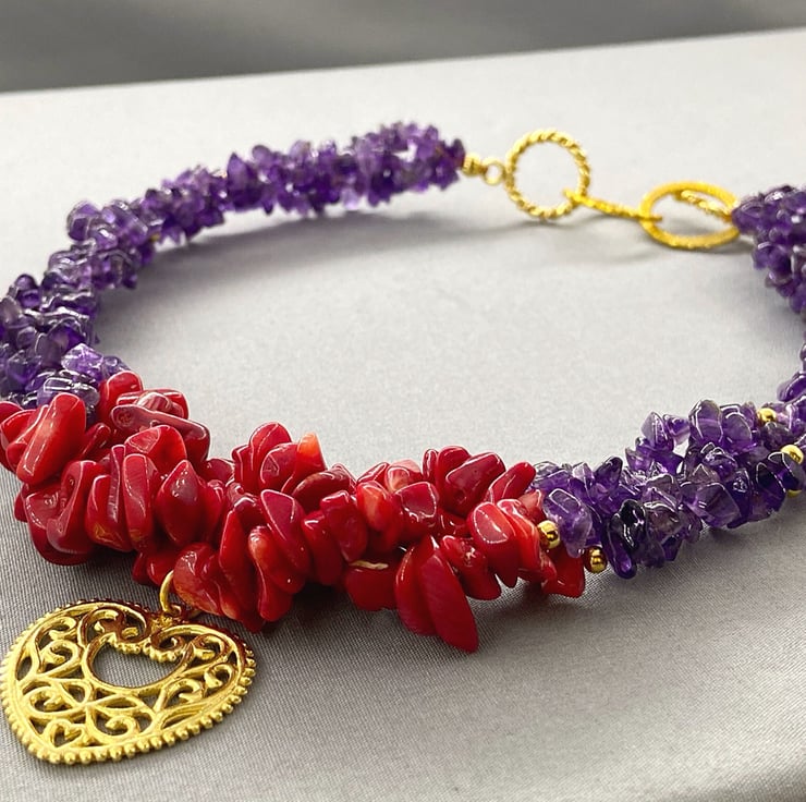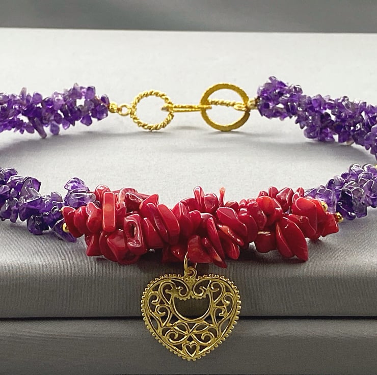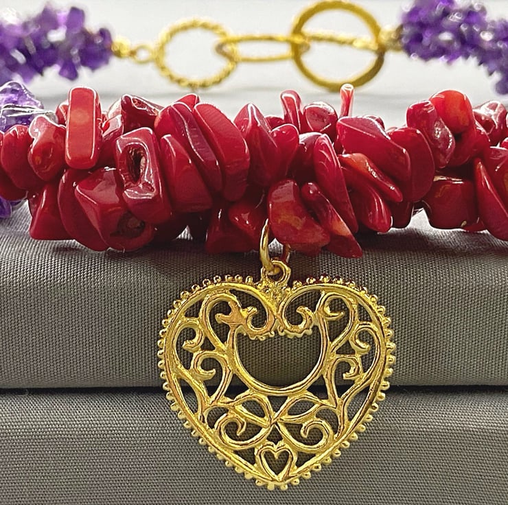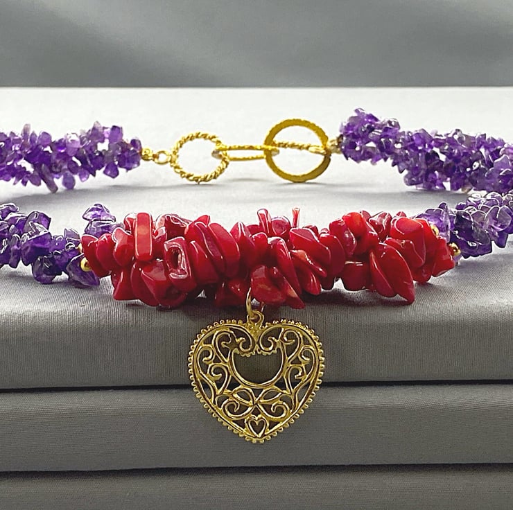 A striking chunky choker necklace featuring gemstone chips of natural Amethyst and red Coral and a gold filled filigree heart charm as a pendant.