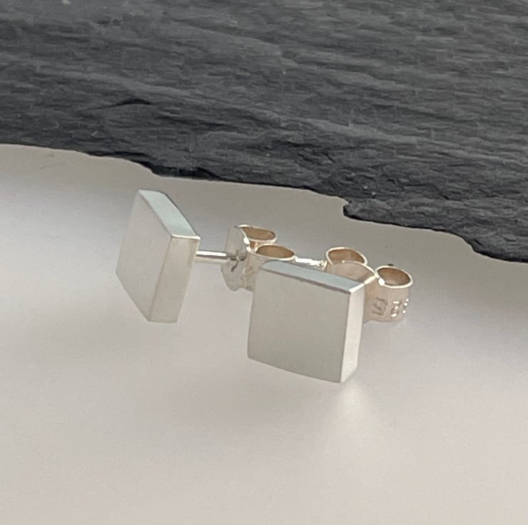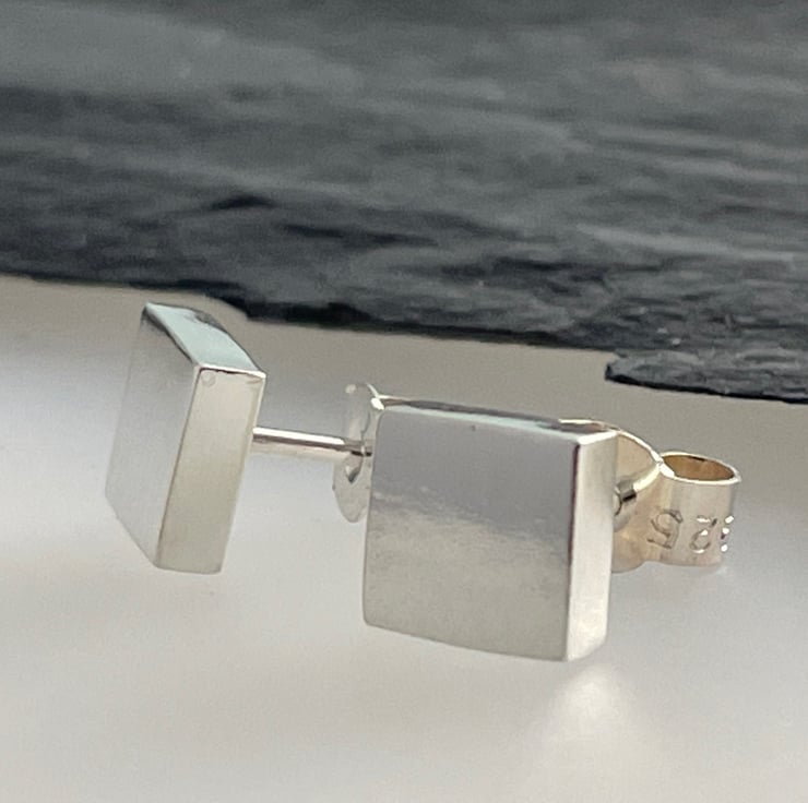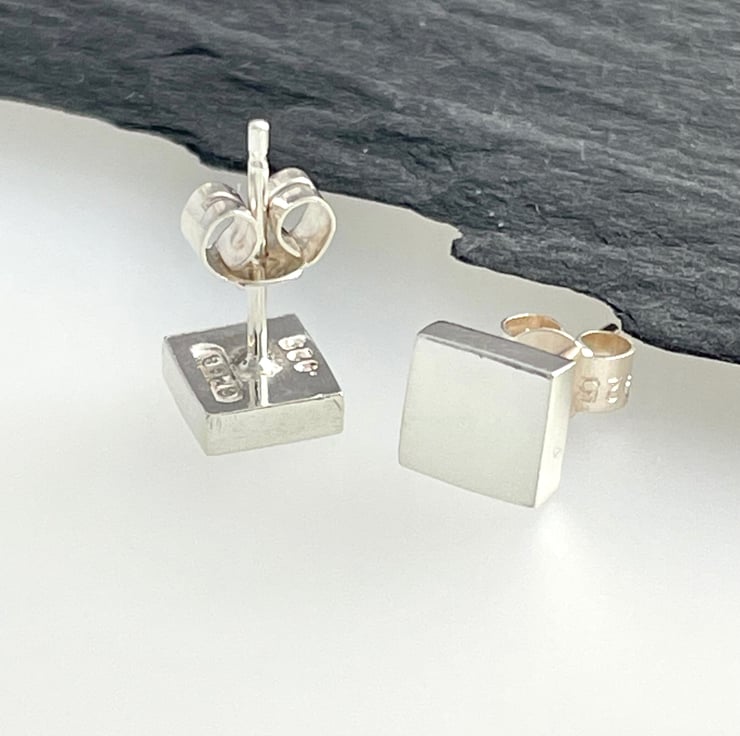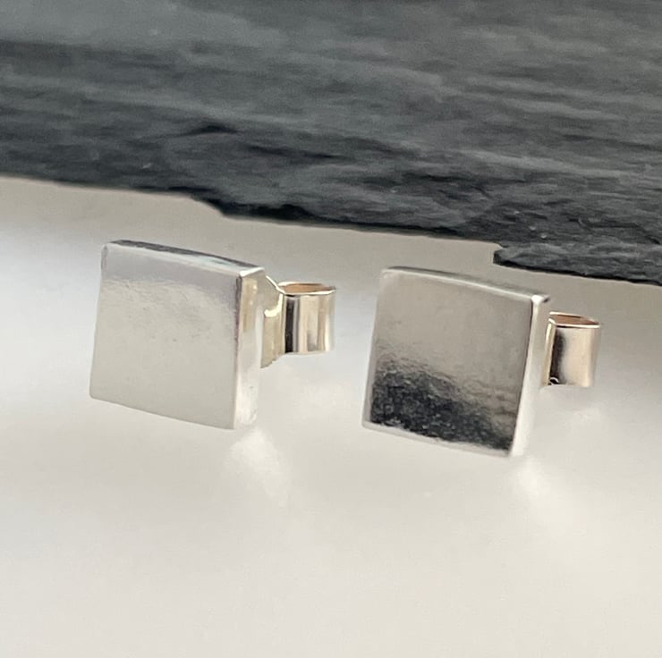 These lovely small chunky minimalist square ear stud earrings have been cut by hand from solid 2mm thick 925 sterling silver sheet. They have 11mm long silver pin fittings in the centre and are secured with stamped (925) sterling silver scrolls/butterflys. They have a plain smooth surface and are finished off with a high polished shine.