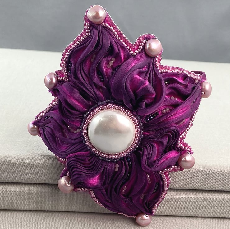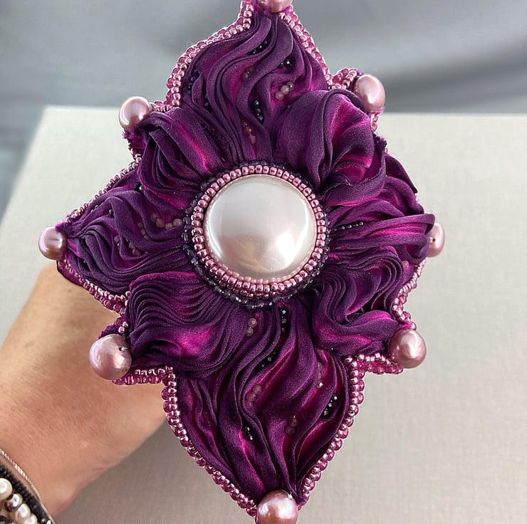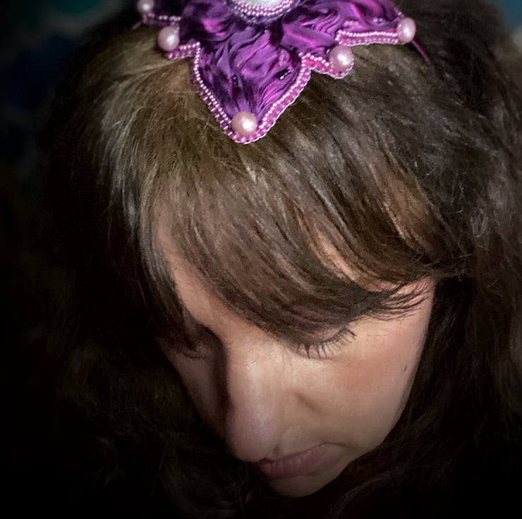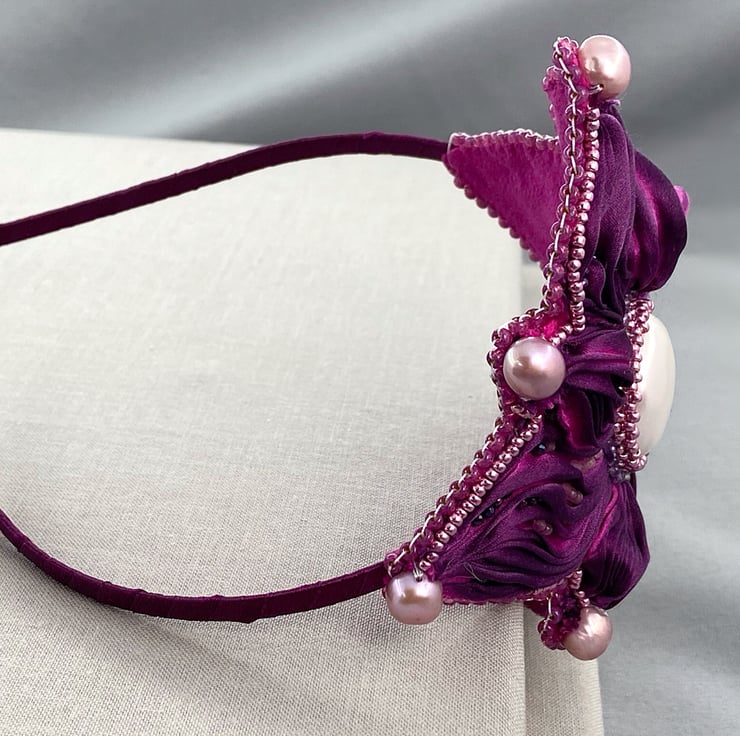 A stunning floral fascinator headband using shibori silk, light pink cultured pearls, spinel and Rubellite with a shell pearl cabochon. The hues in the silk is absolutely beautiful when you see this in real life with a subtle sparkle of the spinel and rubellite too.