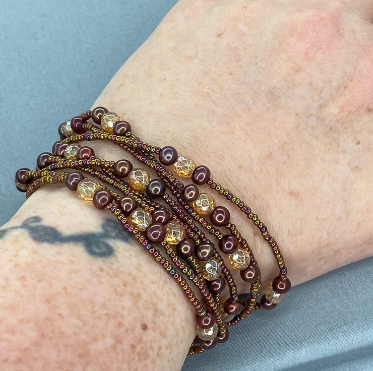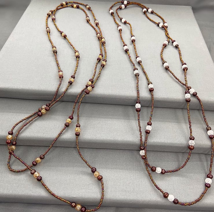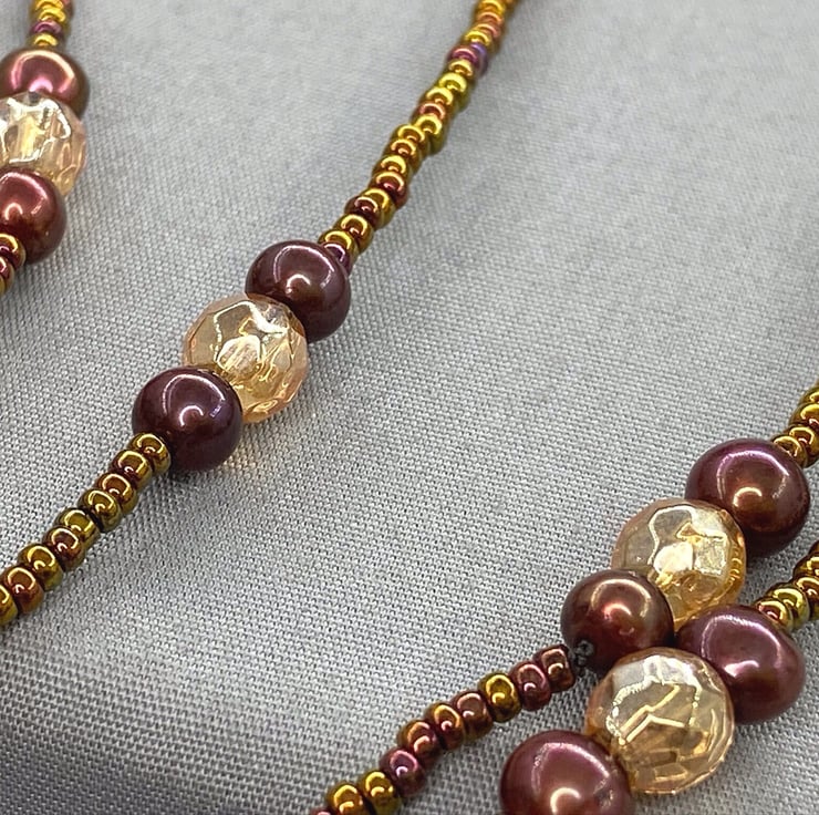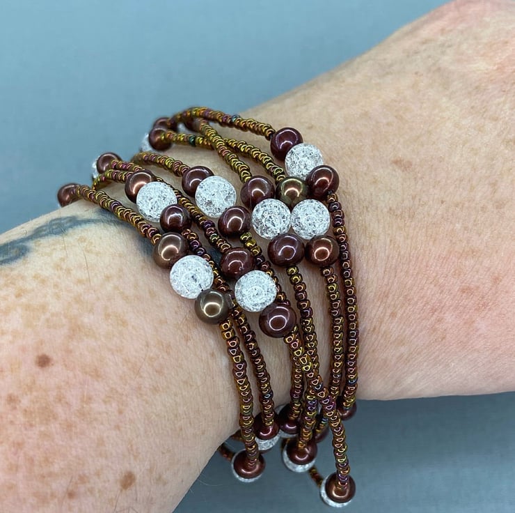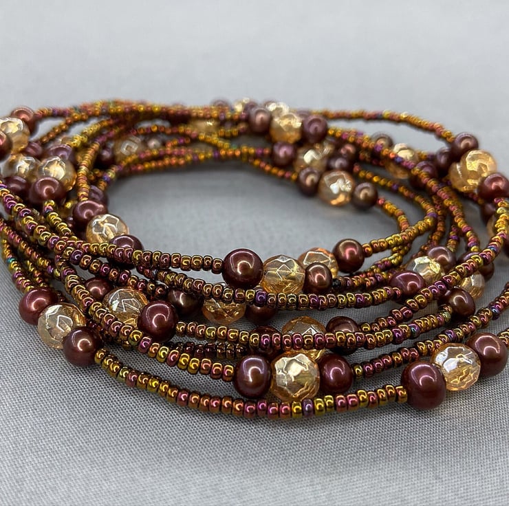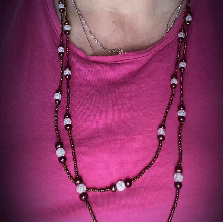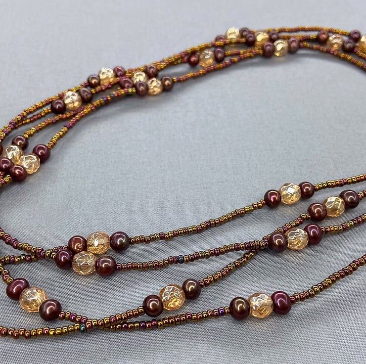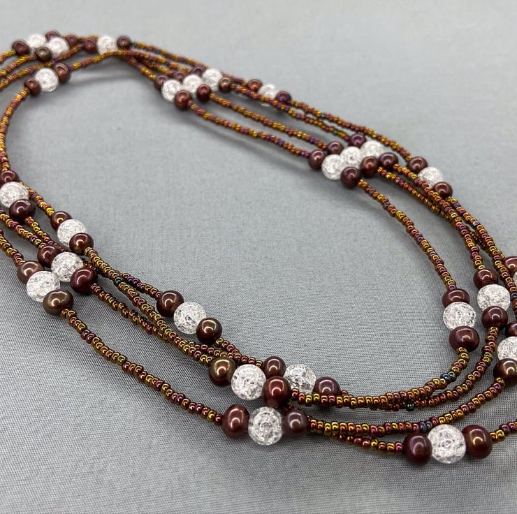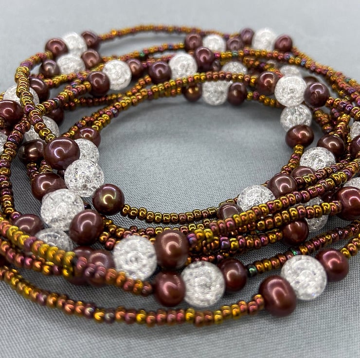 A versatile piece of jewellery which is my extra long, 62 inch beaded necklace featuring Quartz & near round brown cultured pearls with miyuki seed beads that can be worn doubled up as a necklace or as wrapped several times as a bracelet.