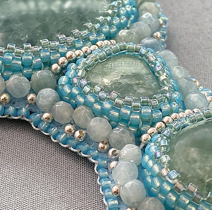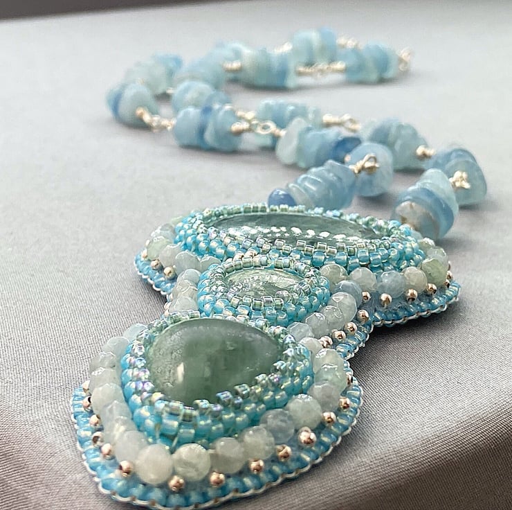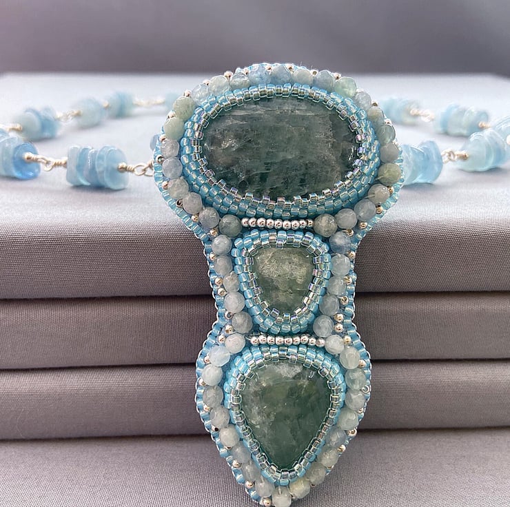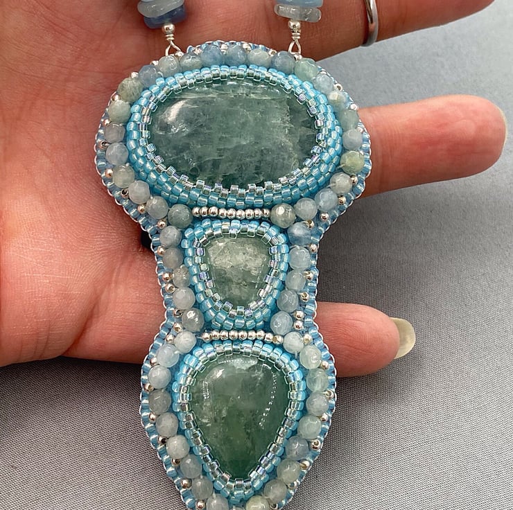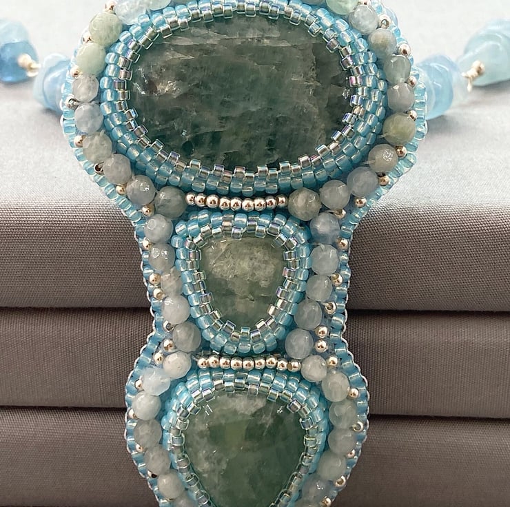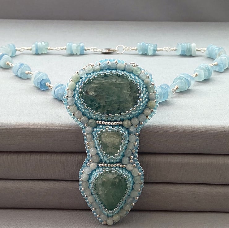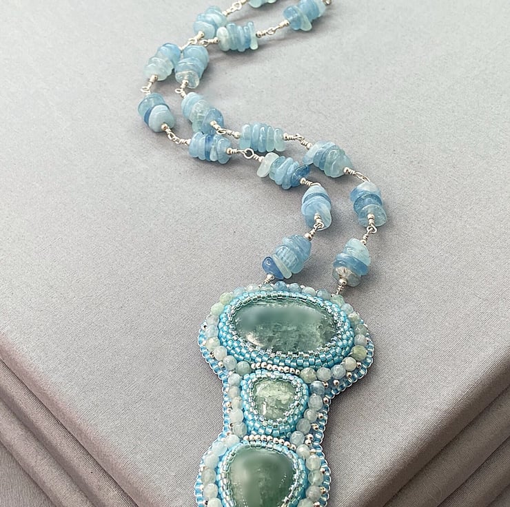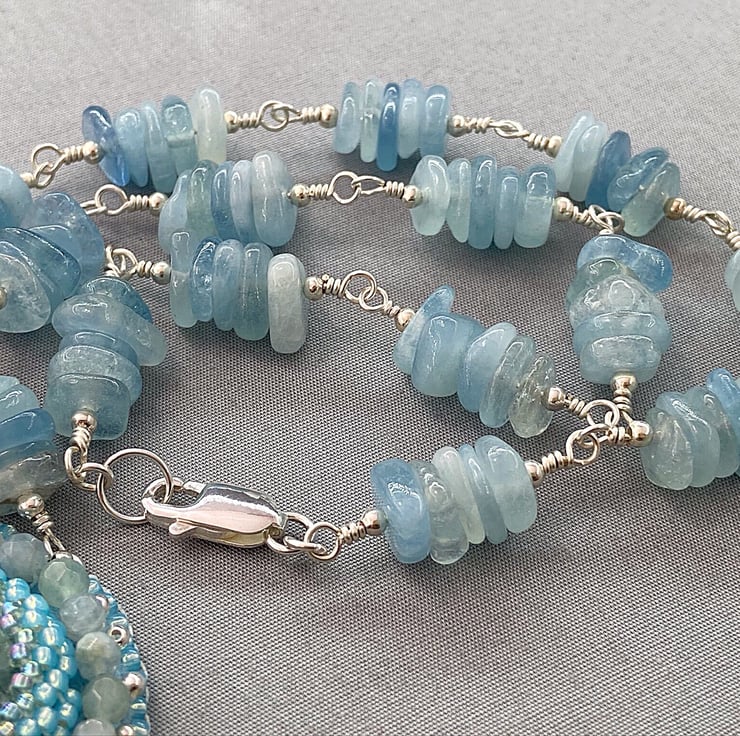 A stunning beaded pendant necklace featuring lots of Aquamarine with sterling silver. The chain part is Aquamarine also. A truly unique and one of a kind piece that no one else will ever own.