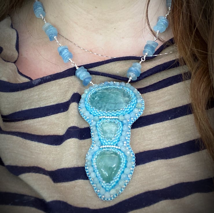 A stunning beaded pendant necklace featuring lots of Aquamarine with sterling silver. The chain part is Aquamarine also. A truly unique and one of a kind piece that no one else will ever own.
