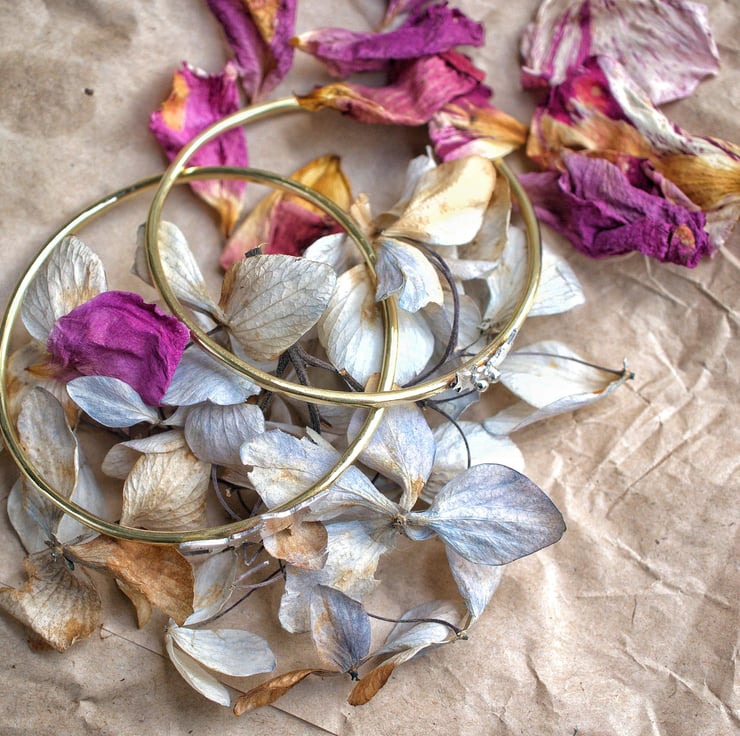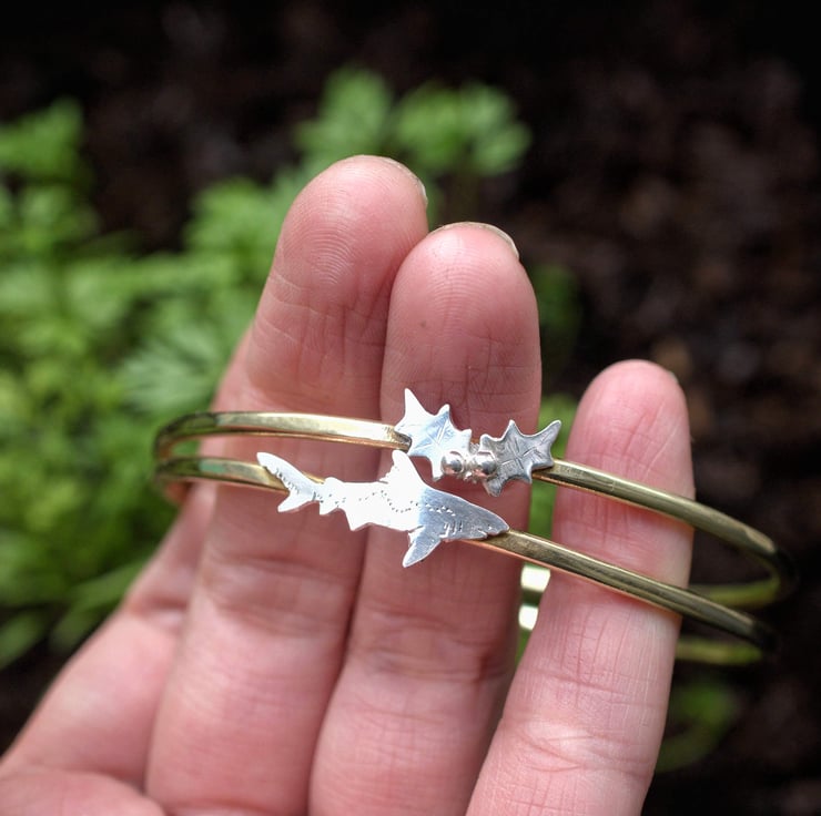 Two brass bangles with holly and shark silver detail