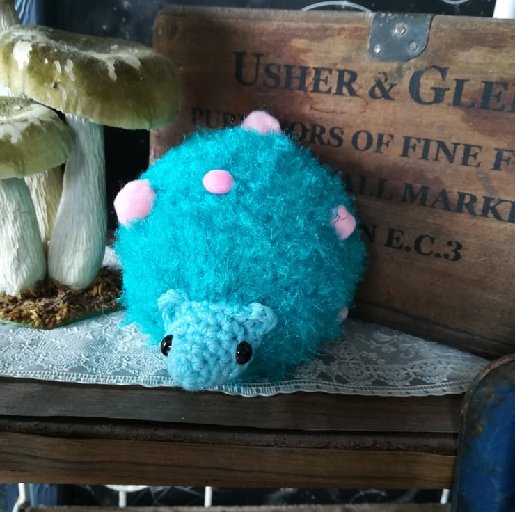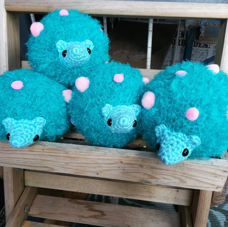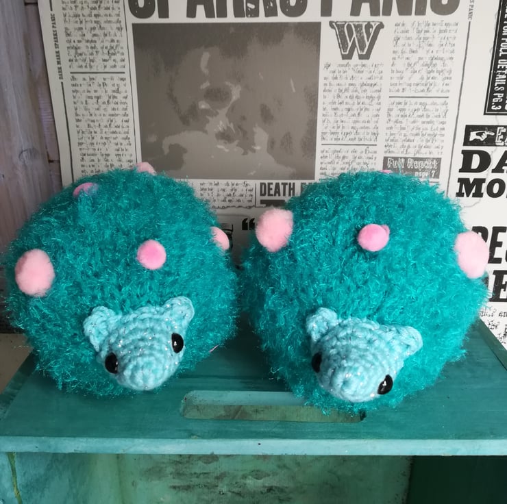 These magical sweetshop inspired puffs are made from a lovely fluffy turquoise yarn. They have little pink pom poms on them.