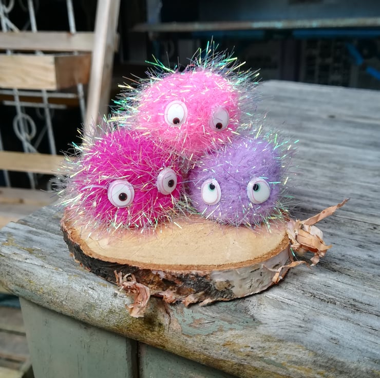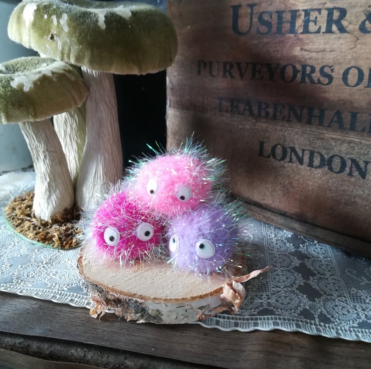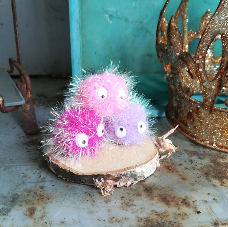 This display features three little Pufflings and makes a great display piece for a desk. They are attached to a wooden base and are sparkling.