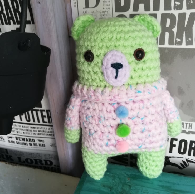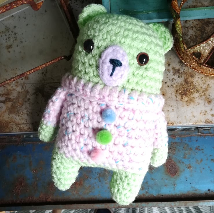 This bear is made from lovely pastel colours and has little pom poms at the front.