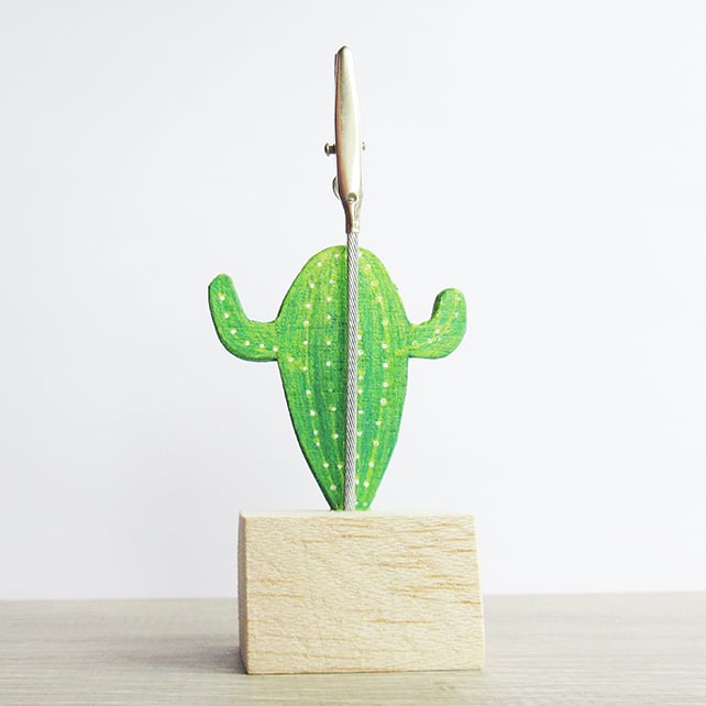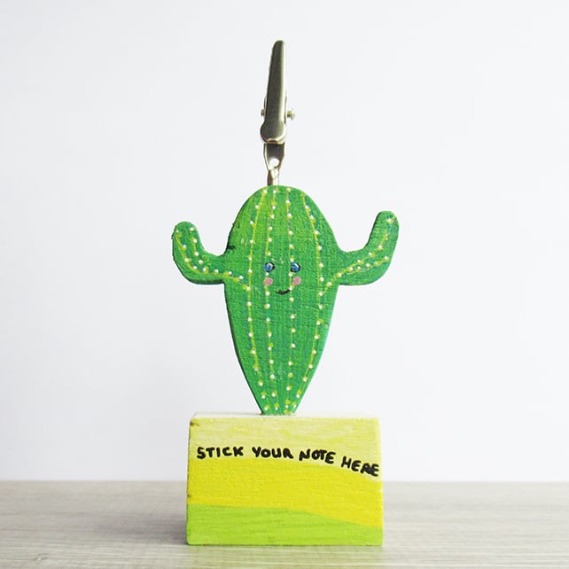 Cute cactus memo or photo holder, comprised of a hand carved and hand acrylic painted wooden cactus.