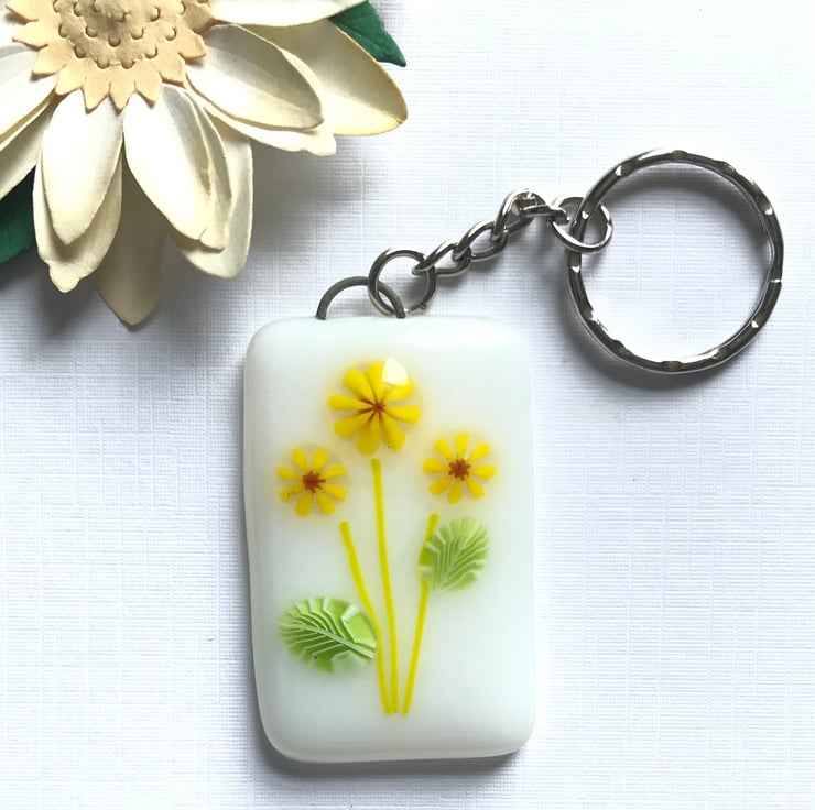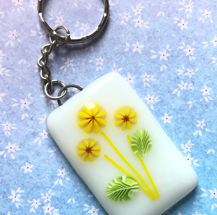 Pretty Keyring with three bright and cheerful yellow flowers. The glass measures approximately 5cm x 3cm and with the keychain is approximately 10cm in length. Postage is included in the price.